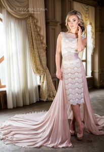 La jupe se fixe grâce à un crochet discret sur une ceinture fine, assurant un maintien parfait et un rendu harmonieux. Le tissu en mousseline légère confère à la traîne un mouvement fluide et gracieux, tandis que l’ouverture à l’avant met en valeur la jupe courte portée en dessous.