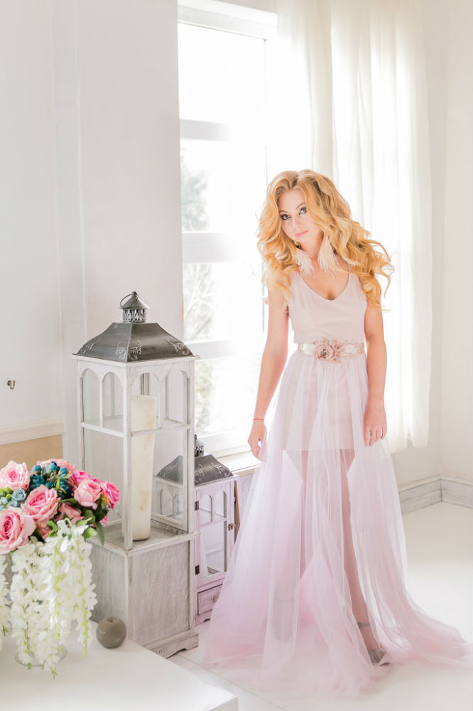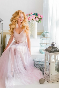 L’ensemble est sublimé par une longue jupe amovible en tulle, qui ajoute volume, légèreté et une touche de romantisme à votre allure.