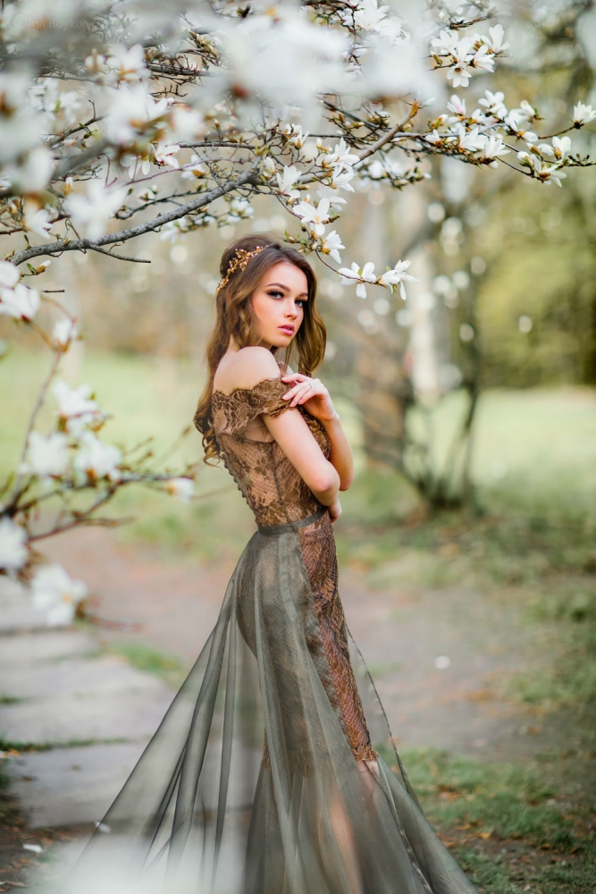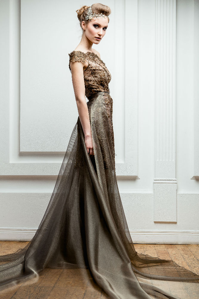 Cet ensemble unique est composé d’une robe courte transparente en dentelle française Chantilly, accompagnée de jupes amovibles :