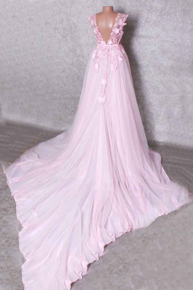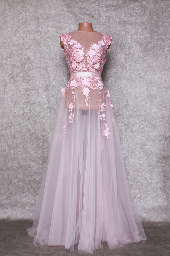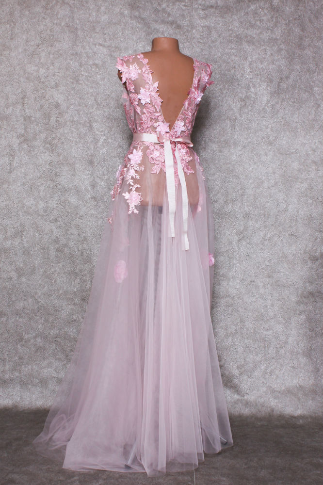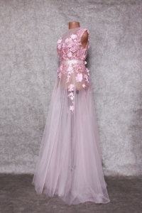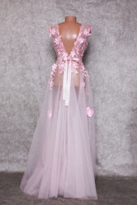 Une robe en tulle semi-transparente avec coques intégrées pour garantir opacité et maintien de la poitrine, délicatement décorée de dentelle et de fleurs 3D.