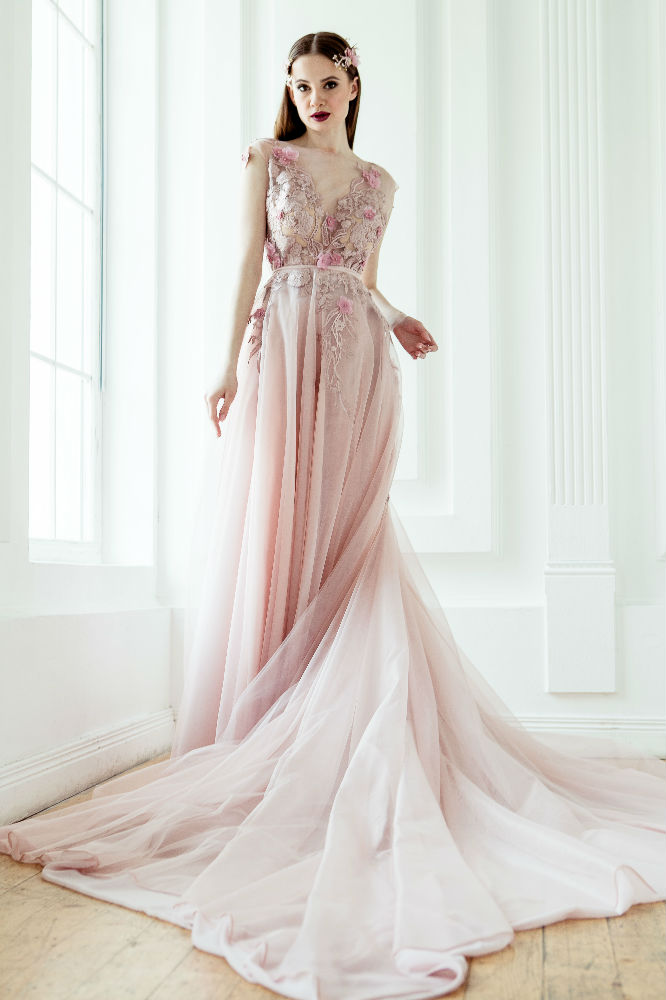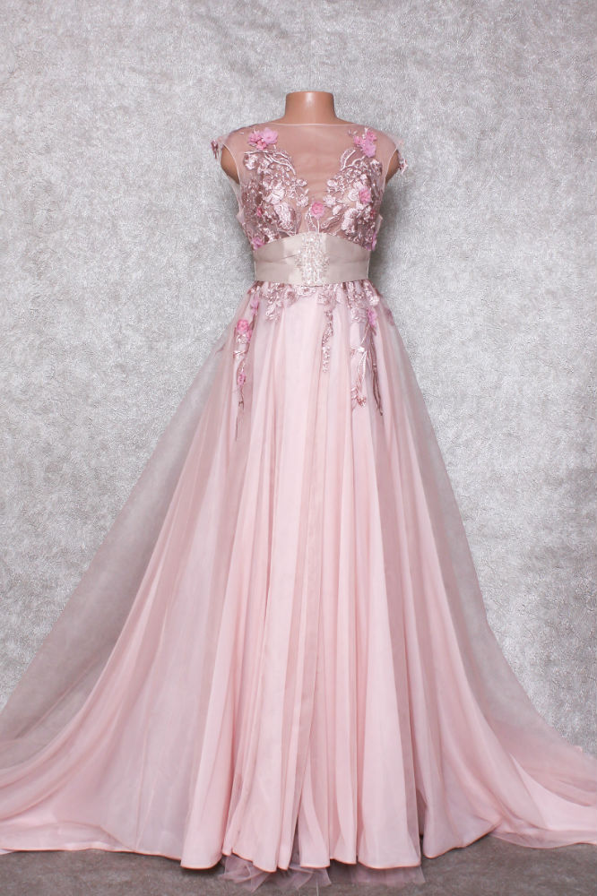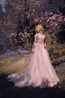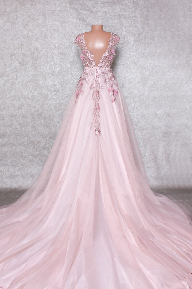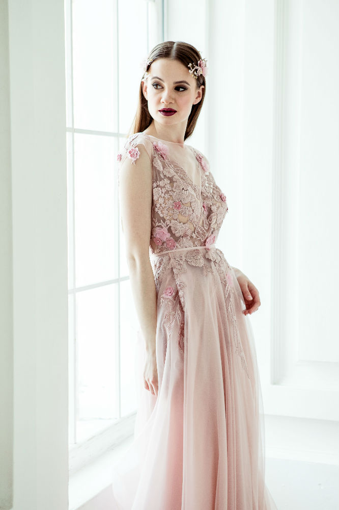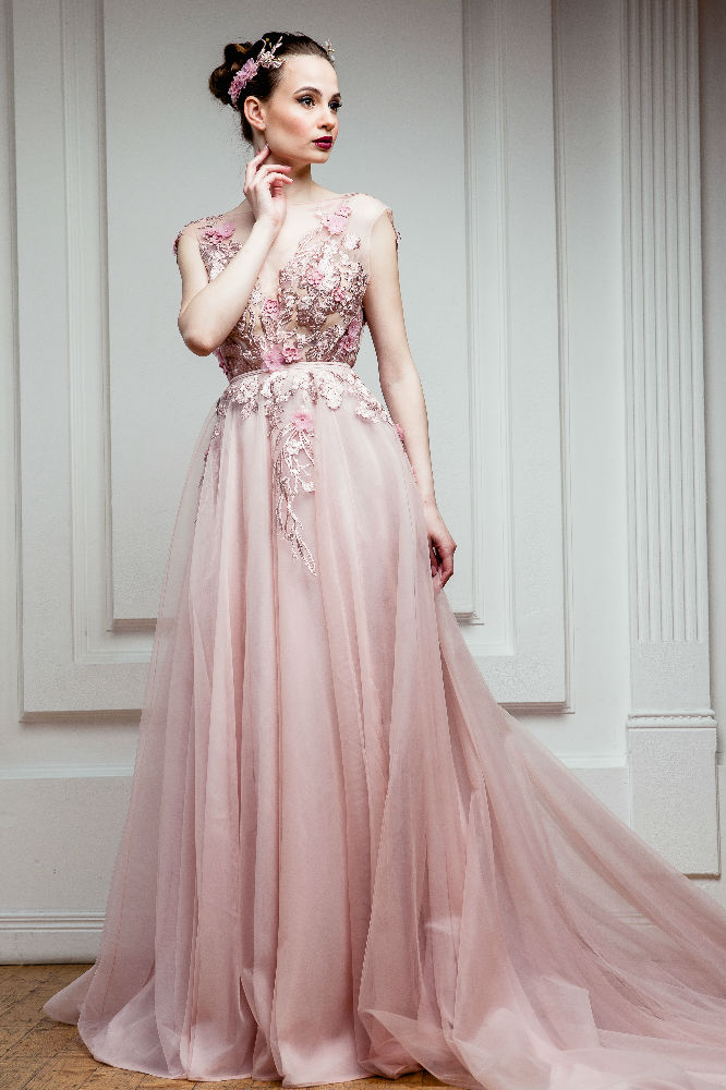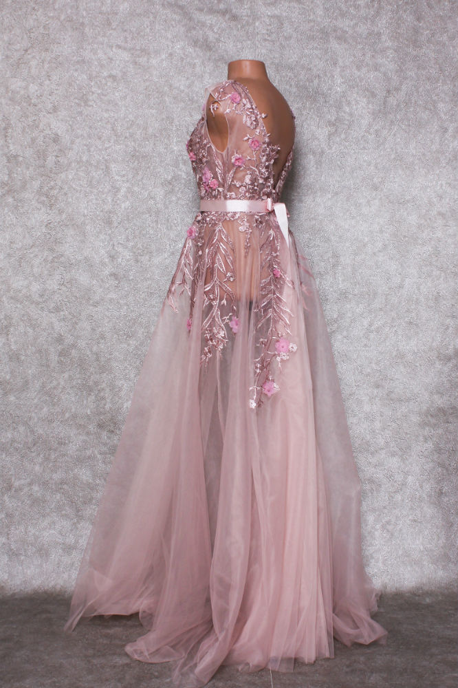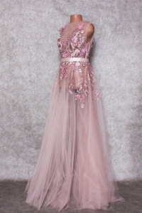 Une robe en tulle semi-transparente avec coques intégrées pour garantir opacité et maintien de la poitrine, délicatement décorée de dentelle et de fleurs 3D.