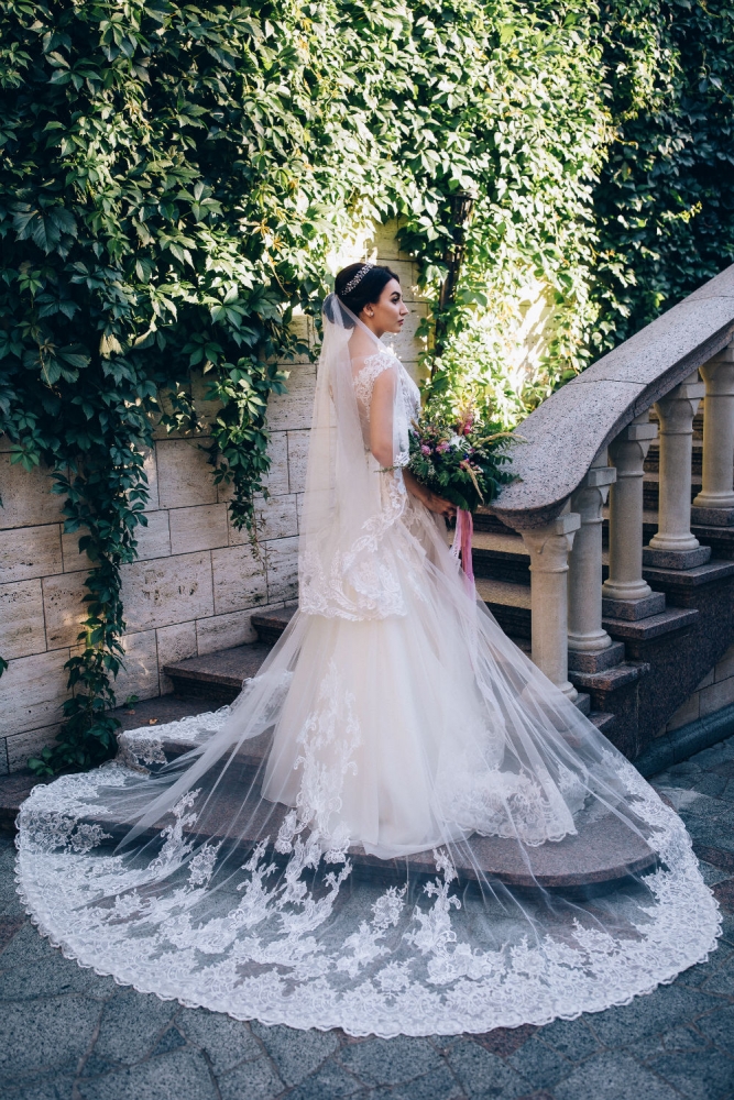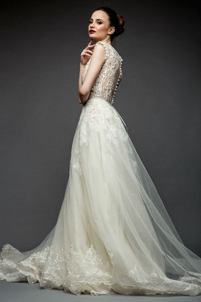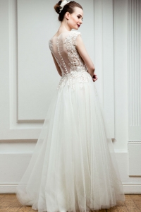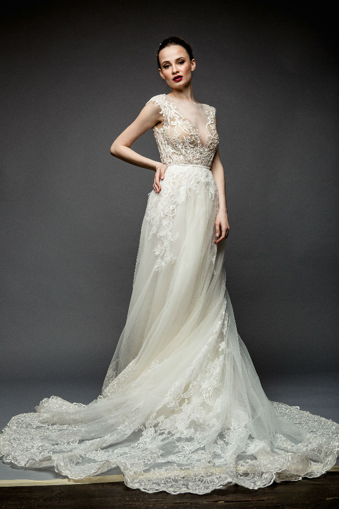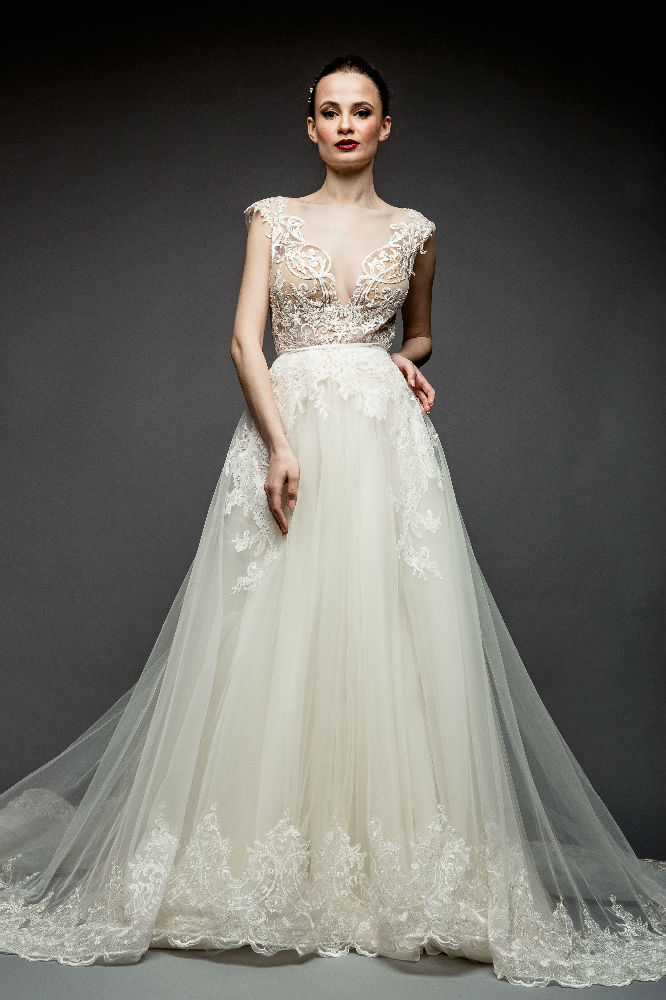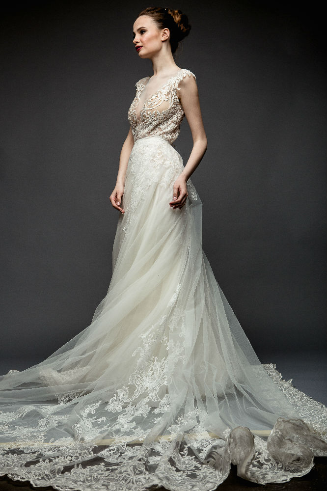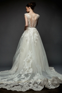 Cet ensemble élégant se compose d’une robe semi-transparente ornée de dentelle et d’une jupe amovible avec traîne.