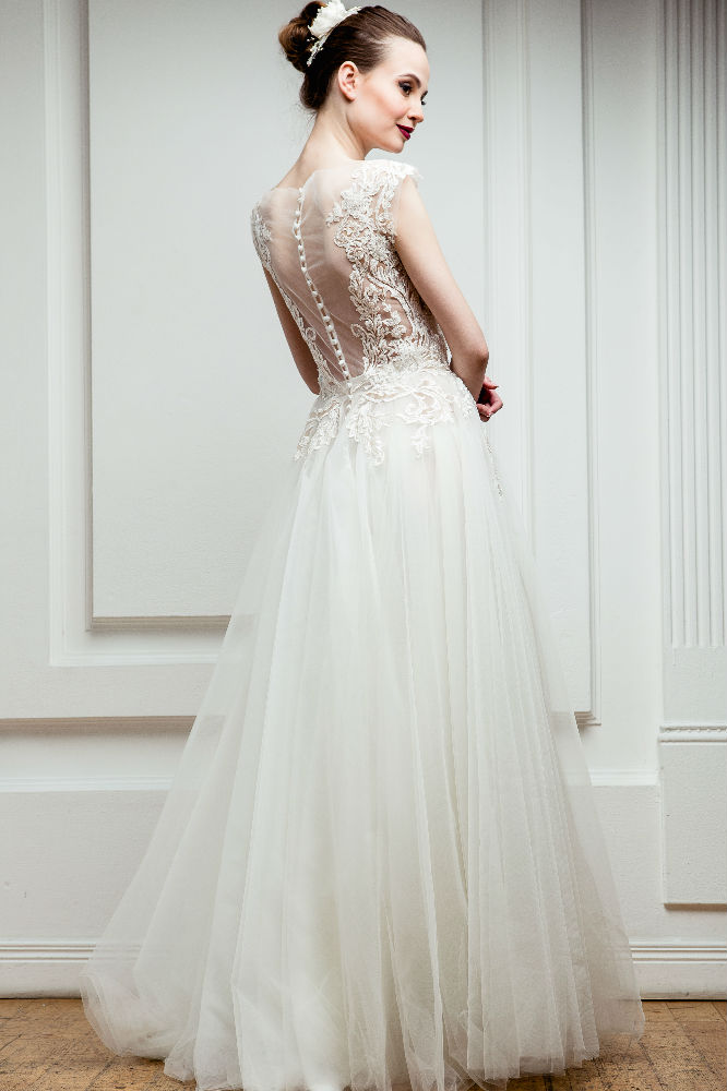 Doublure : longue jupe en satin opaque, disponible en ivoire, beige ou rose poudré.