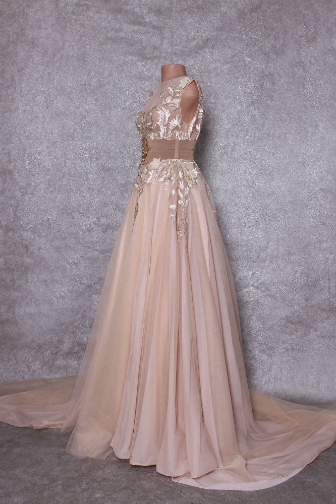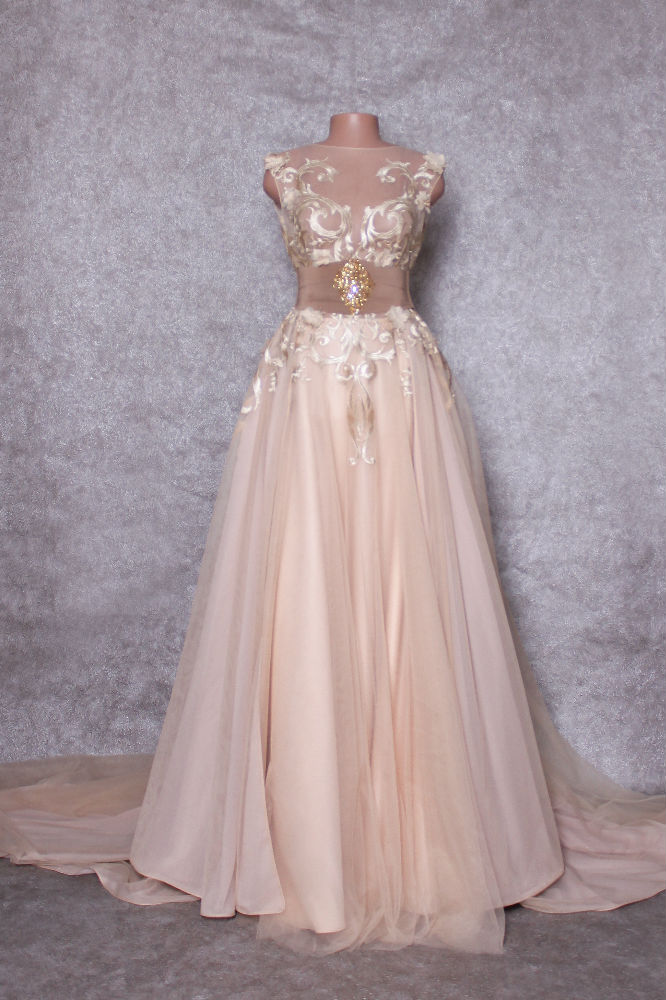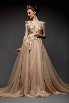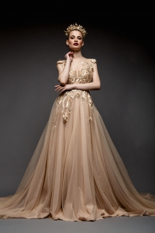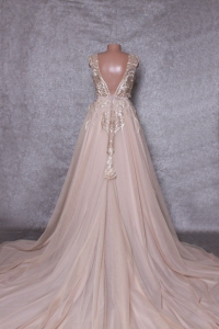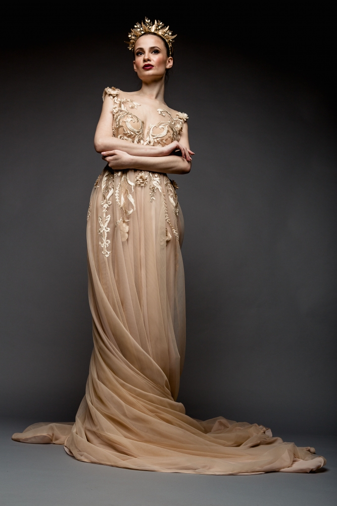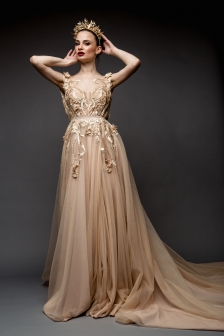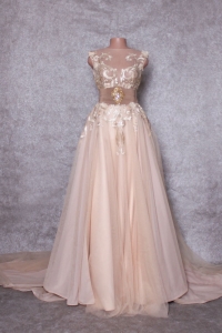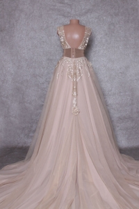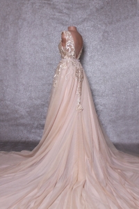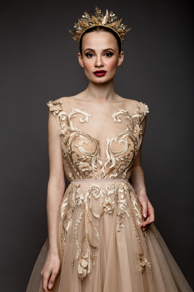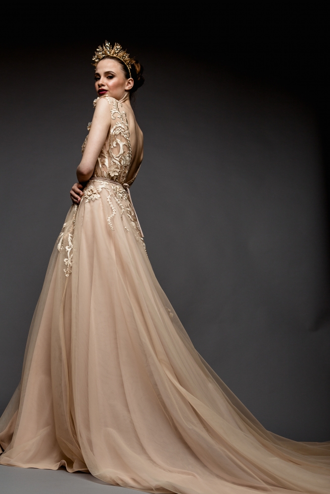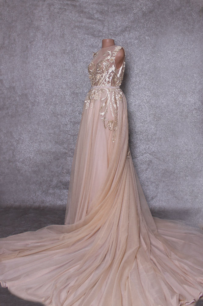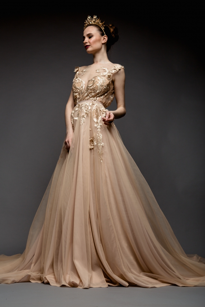 Cet ensemble unique se compose d’une robe transparente en tulle, décorée de dentelle 3D, accompagnée d’une jupe amovible avec traîne.