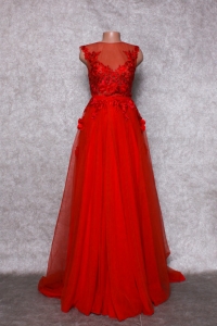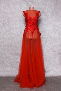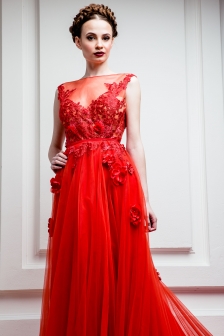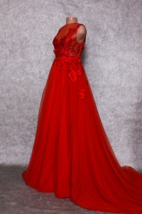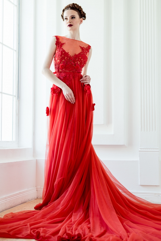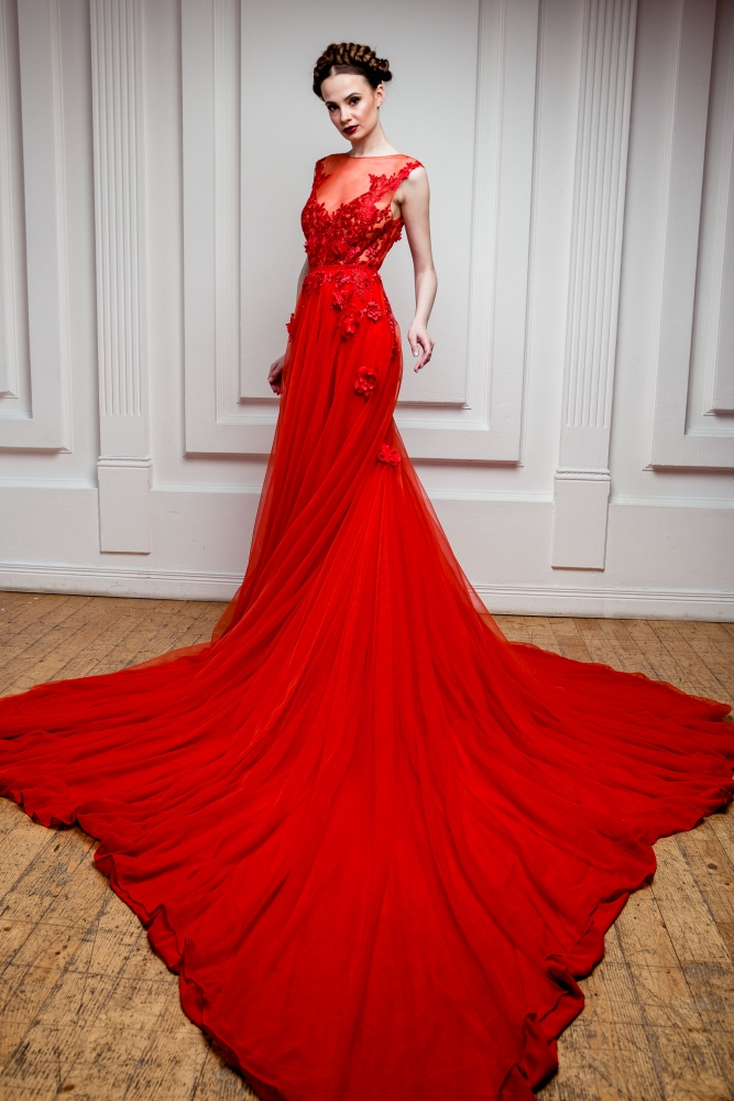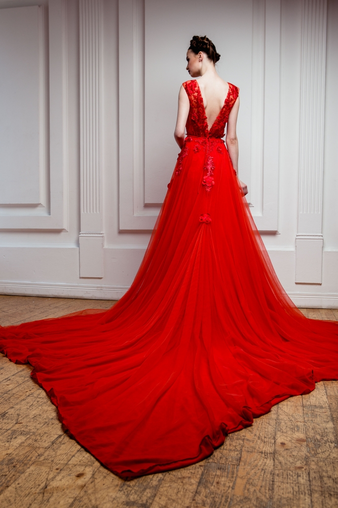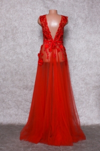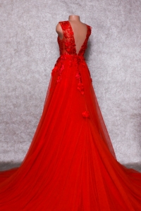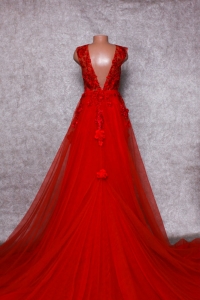 Cet ensemble unique se compose d’une robe transparente en tulle, décorée de dentelle 3D, accompagnée d’une jupe amovible avec traîne.