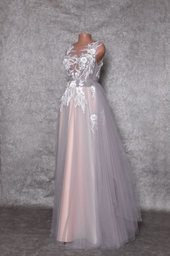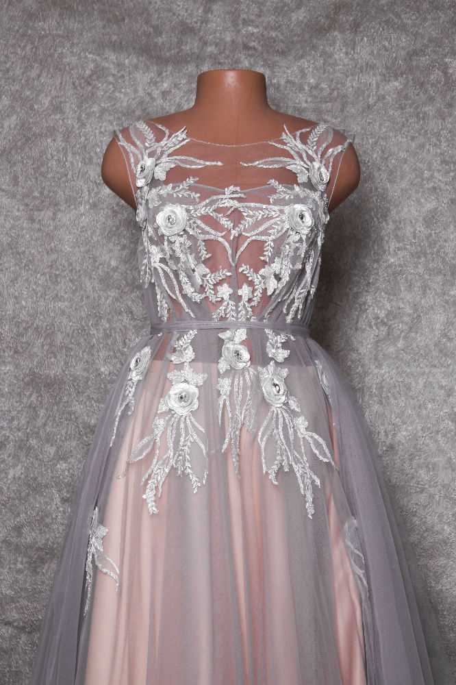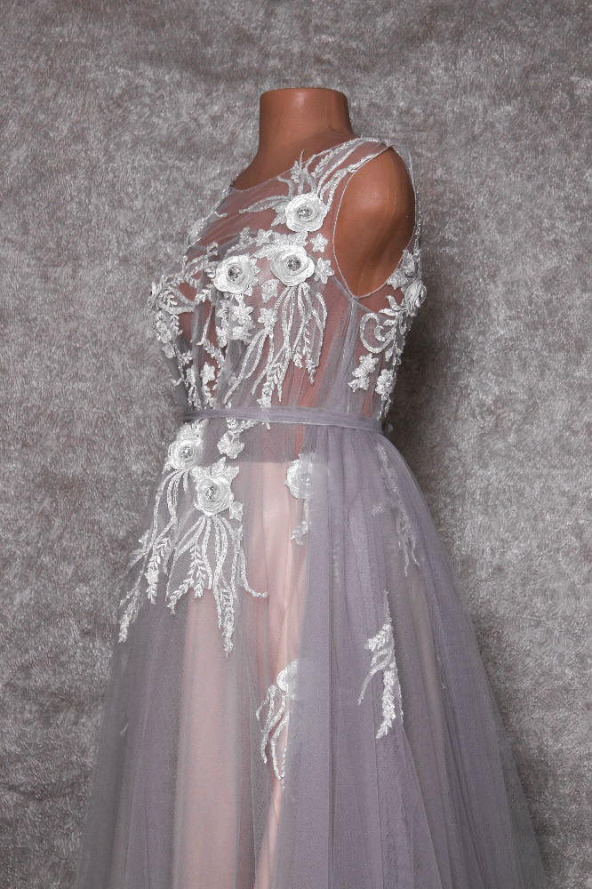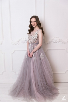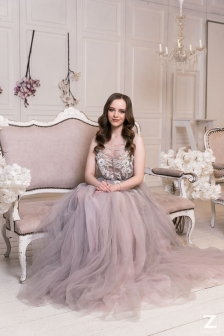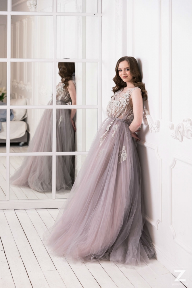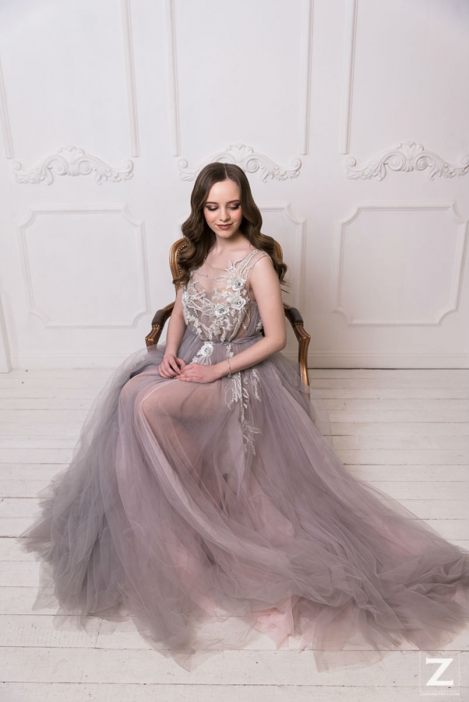Élégance aérienne et féminité raffinée – cette robe de soirée signée Liliya Atelier est réalisée en tulle européen semi-transparent de couleur gris clair aux reflets lavande. Le bustier et la jupe sont richement décorés d’applications de dentelle cousues à la main, tandis qu’une jupe volumineuse amovible à demi-traîne apporte légèreté et majesté au mouvement.
