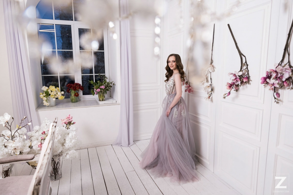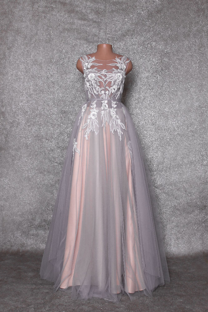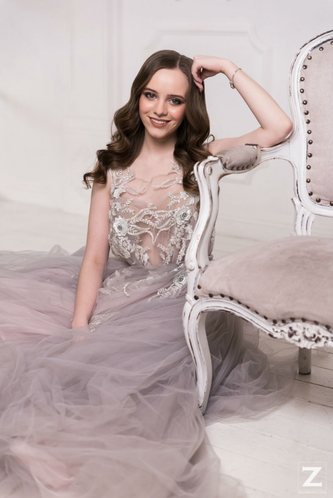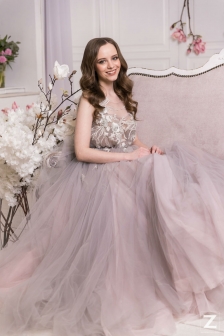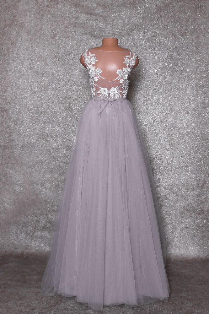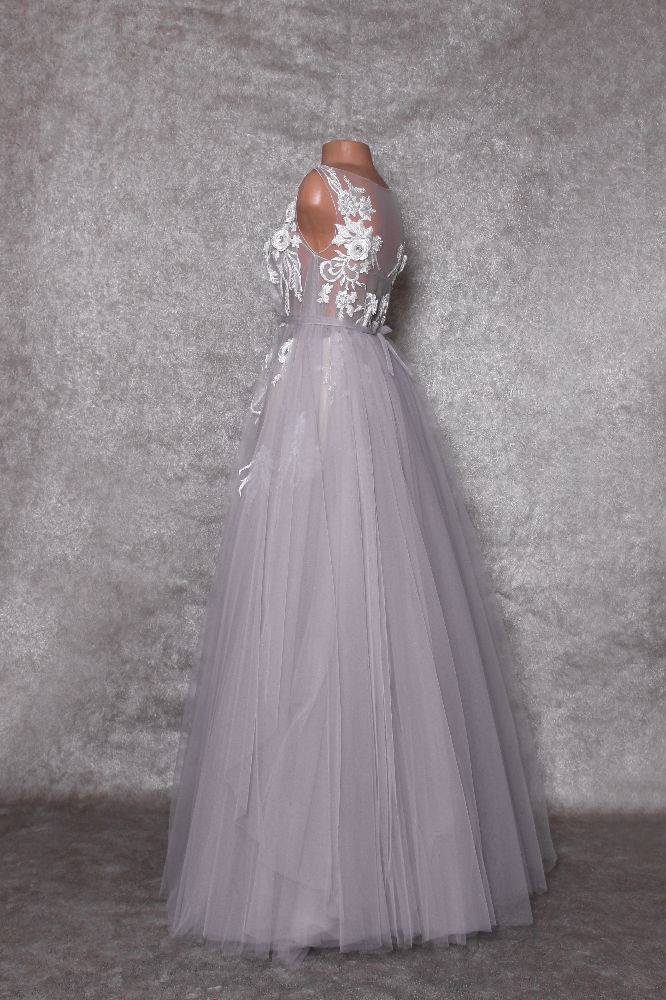 Élégance aérienne et féminité raffinée – cette robe de soirée signée Liliya Atelier est réalisée en tulle européen semi-transparent de couleur gris clair aux reflets lavande. Le bustier et la jupe sont richement décorés d’applications de dentelle cousues à la main, tandis qu’une jupe volumineuse amovible à demi-traîne apporte légèreté et majesté au mouvement.