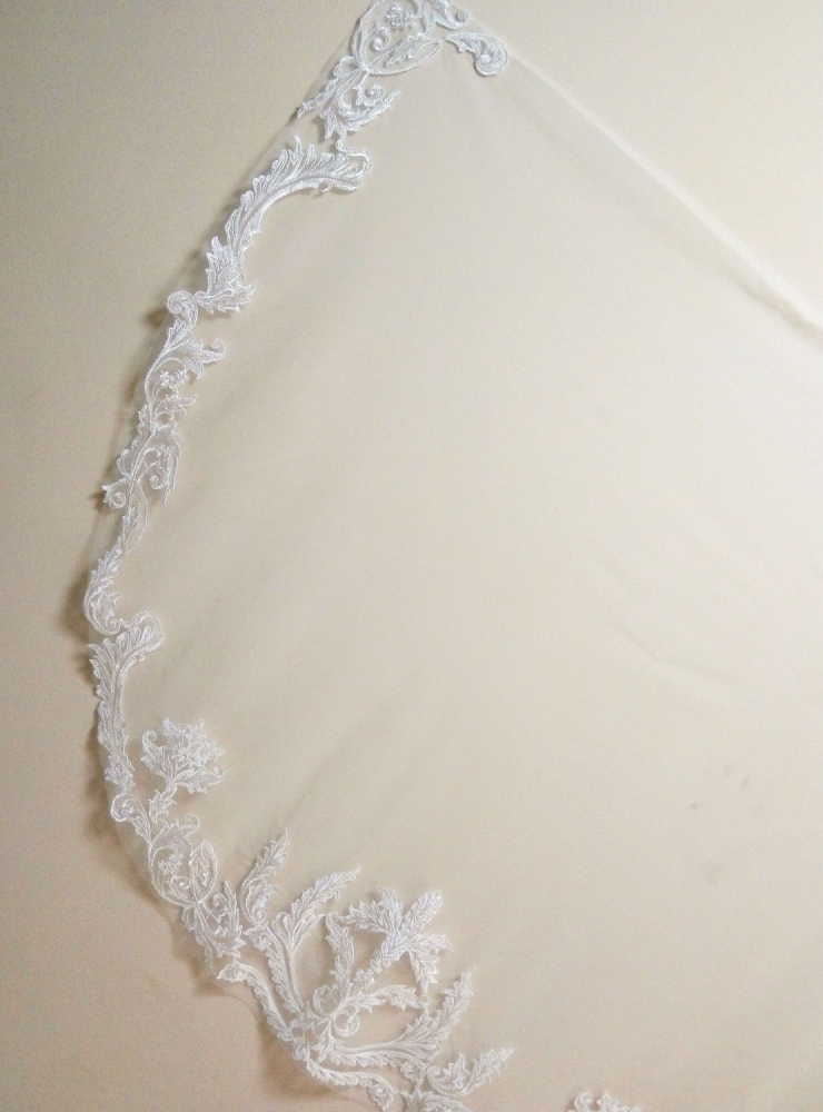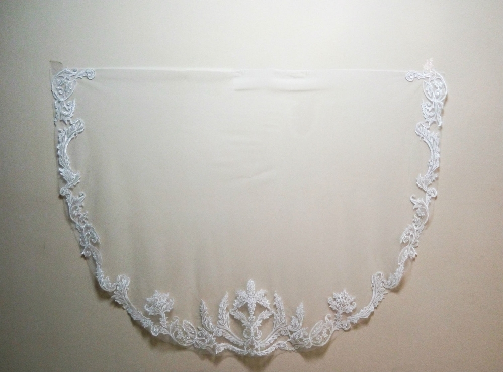 Découvrez le voile de mariée court de Liliya Atelier, décoré avec des applications en dentelle délicates. Le modèle présenté en photo est un voile à un seul étage, longueur 90 cm, parfait pour compléter élégamment votre robe, qu’elle soit riche en dentelle ou minimaliste.