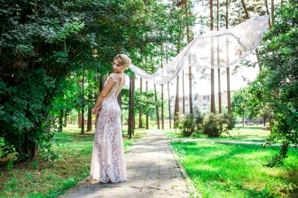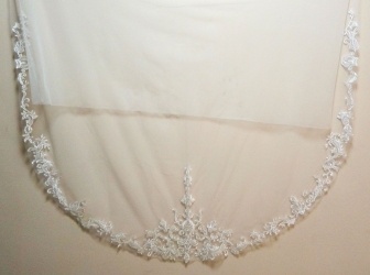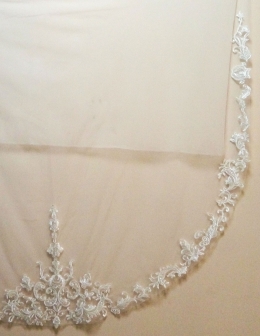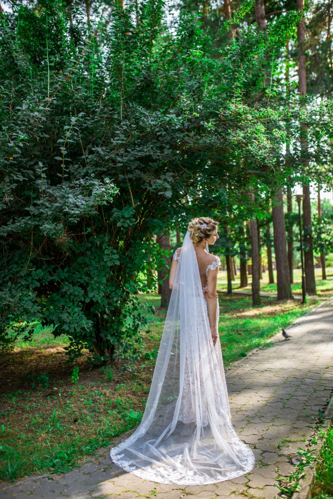 Découvrez le voile de mariée de Liliya Atelier, délicatement décoré avec des applications en dentelle. Le modèle présenté en photo est un voile à un seul étage, longueur 200 cm, parfait pour sublimer votre robe, qu’elle soit richement ornée de dentelle ou minimaliste.
