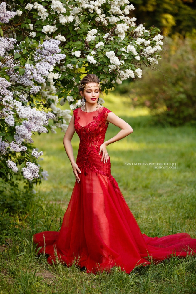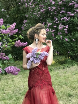 Découvrez la robe de soirée avec traîne de Liliya Atelier, dans une teinte bordeaux-marsala. Cette création unique est décorée à la main avec des applications de plusieurs types de dentelle, offrant un rendu raffiné et sophistiqué.