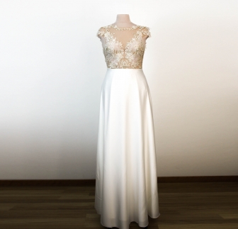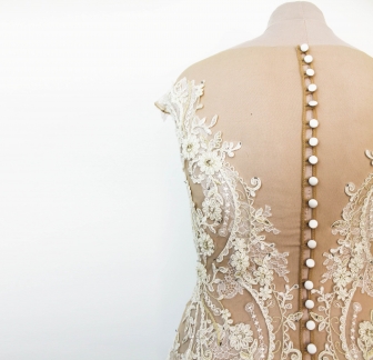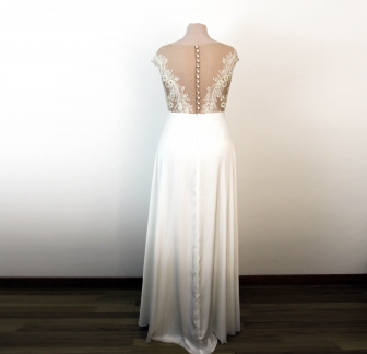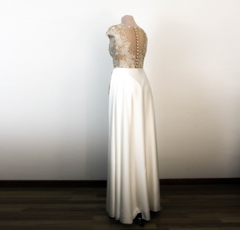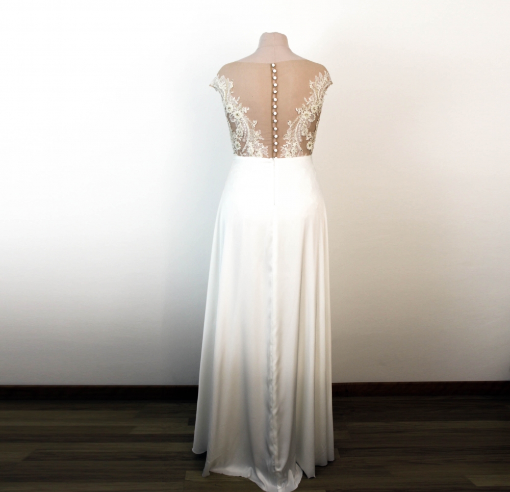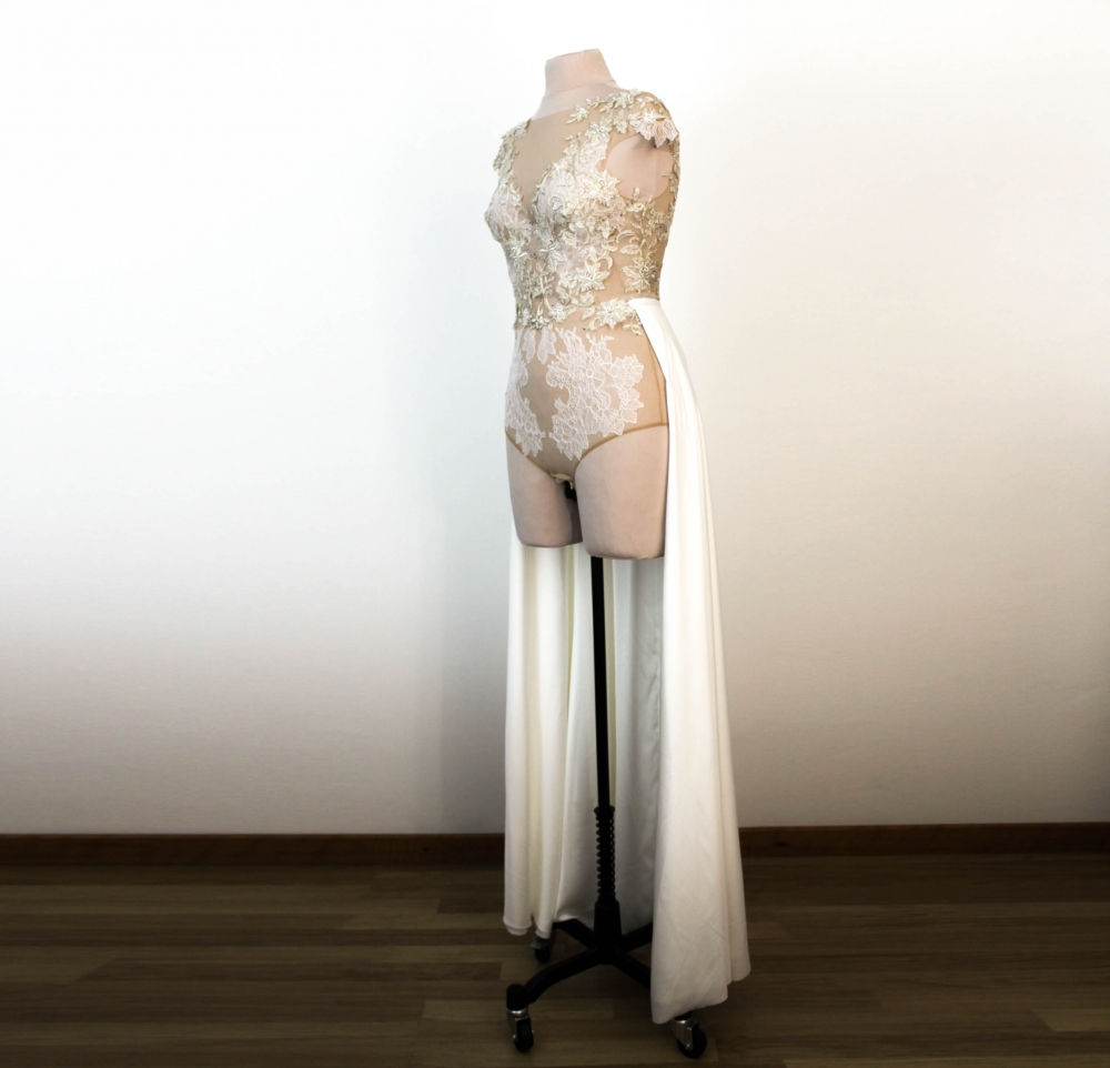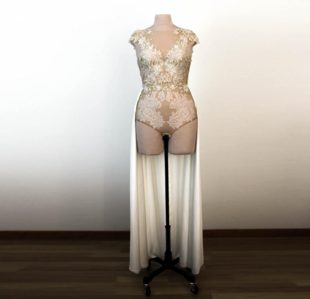 Le body se ferme délicatement dans le dos par une rangée de petits boutons. Les culottes intégrées sont dotées d’une fermeture à crochets discrète pour un confort optimal tout au long de la journée. Le délai de réalisation est d’environ 30 jours, et peut s’allonger à 3–4 mois en haute saison, selon la complexité du modèle et la charge de travail de l’atelier.