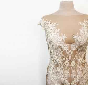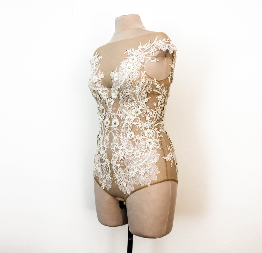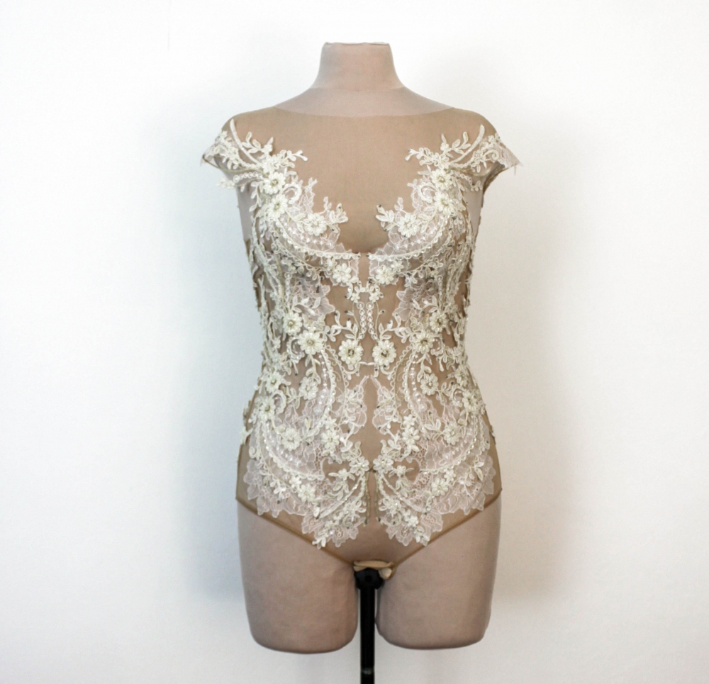Ce body de mariée est réalisé en tulle beige pour un subtil effet de peau nue, créant l’illusion que les appliques de dentelle se posent directement sur votre corps, telles de délicates tatouages florales. La base en tulle devient presque invisible, mettant en valeur la finesse du travail artisanal.