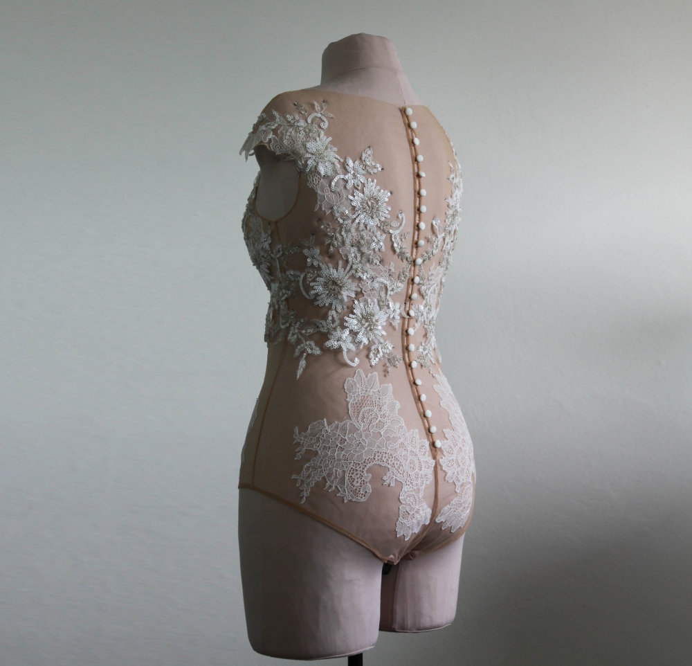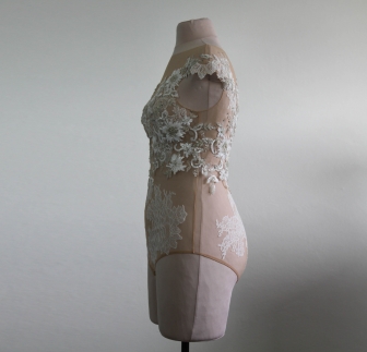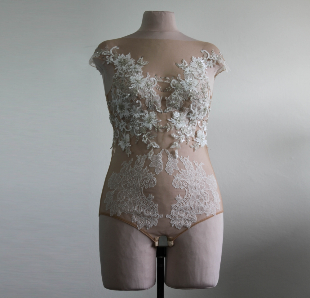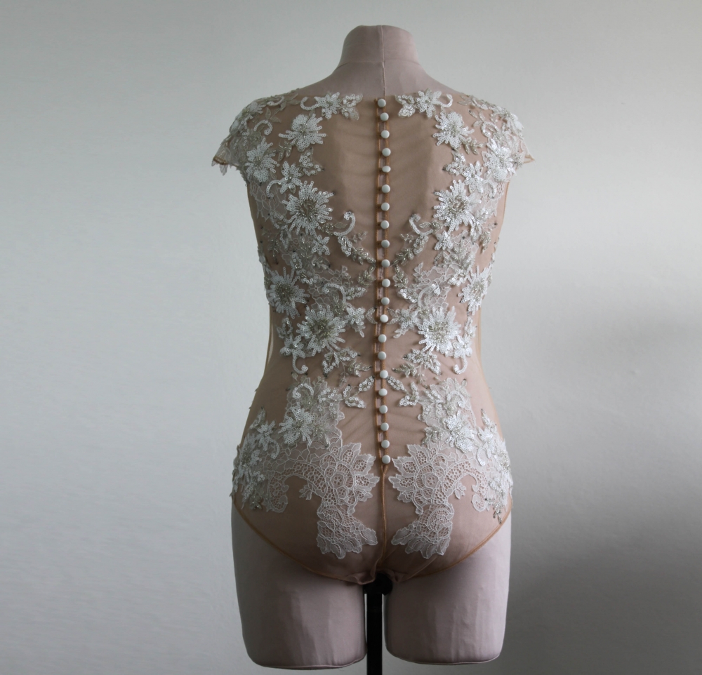 Ce body de mariée est réalisé en tulle beige pour un subtil effet de peau nue, créant l’illusion que les appliques de dentelle se posent directement sur votre corps, telles de délicates tatouages florales. La base en tulle devient presque invisible, mettant en valeur la finesse du travail artisanal.