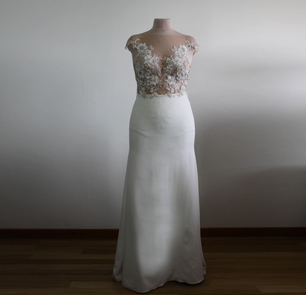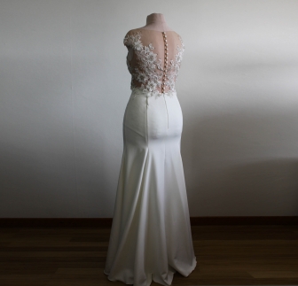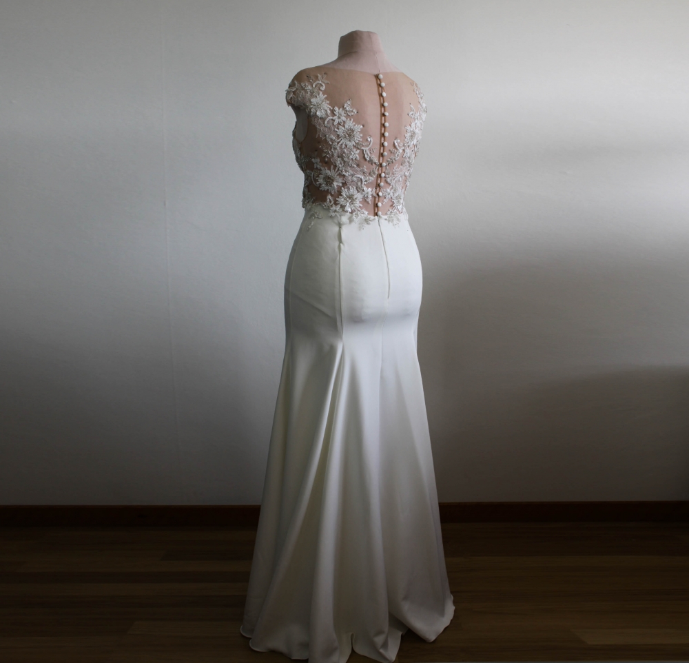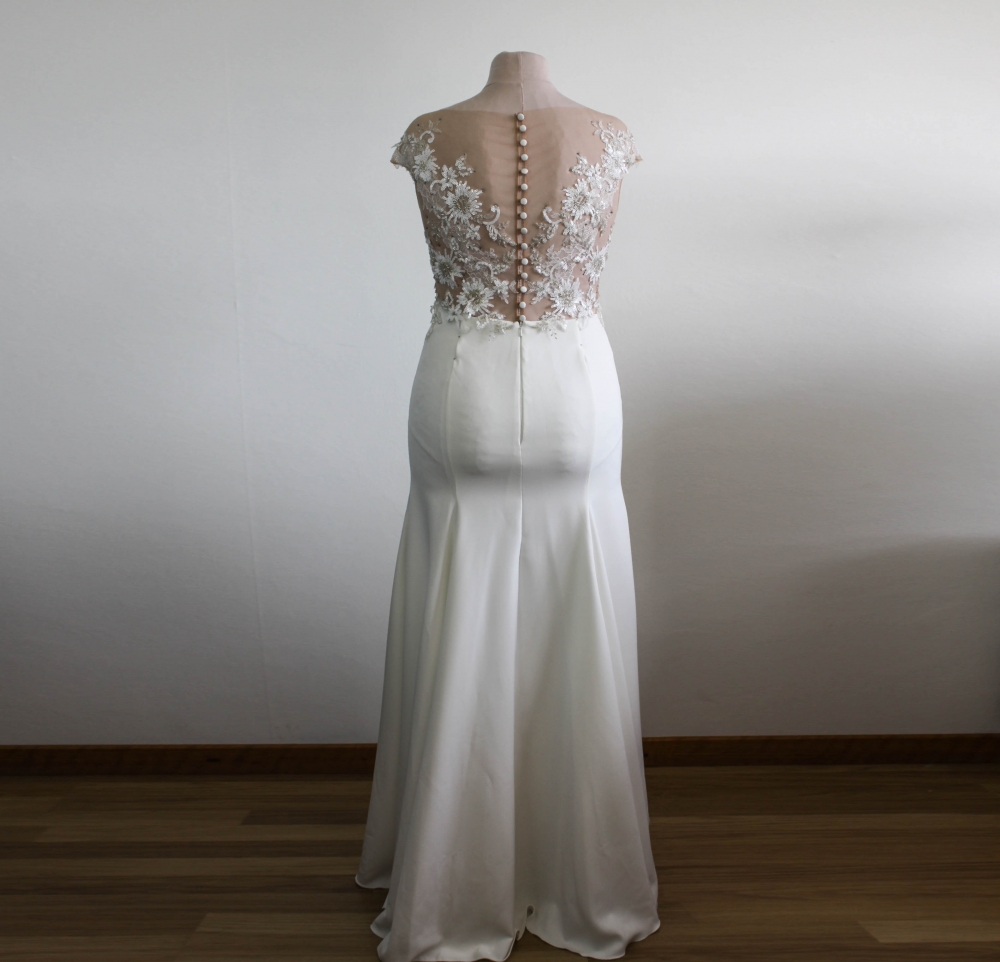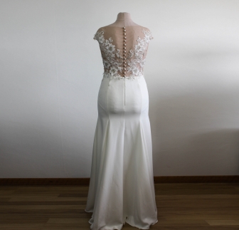 Le body se ferme délicatement dans le dos par une rangée de petits boutons. Les culottes intégrées sont dotées d’une fermeture à crochets discrète pour un confort optimal tout au long de la journée. Le délai de réalisation est d’environ 30 jours, et peut s’allonger à 3–4 mois en haute saison, selon la complexité du modèle et la charge de travail de l’atelier.