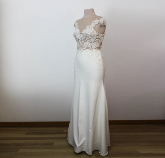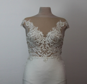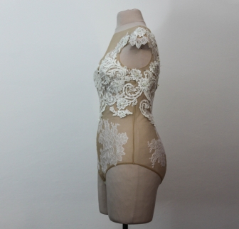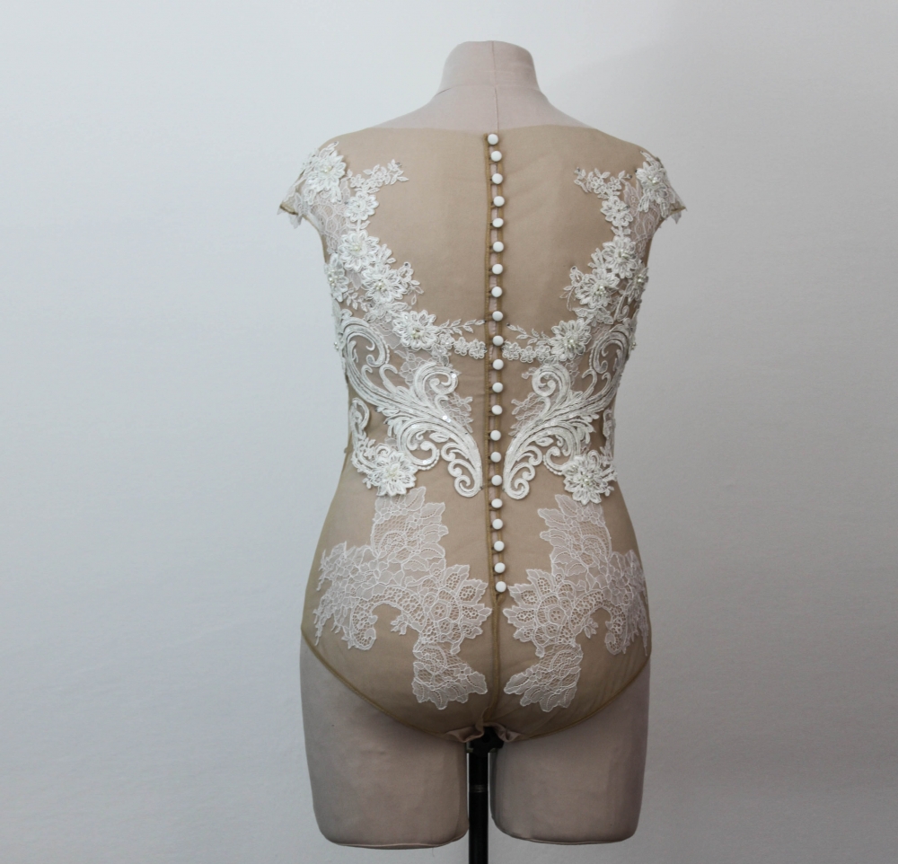 Ce body de mariée est réalisé en tulle beige, pour un subtil effet de peau nue. Il crée l’illusion que les appliques de dentelle se posent directement sur votre corps, telles de délicates tatouages florales.