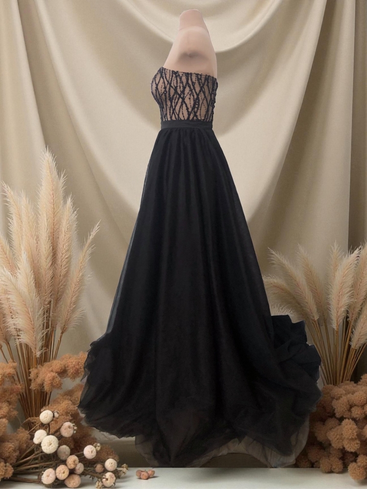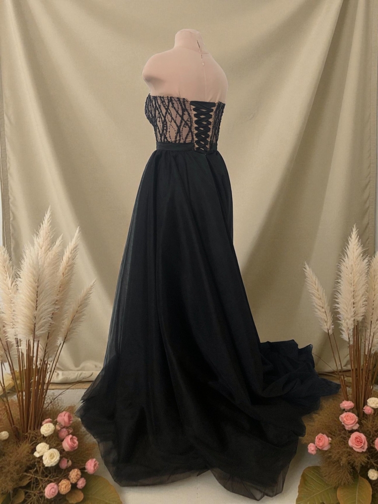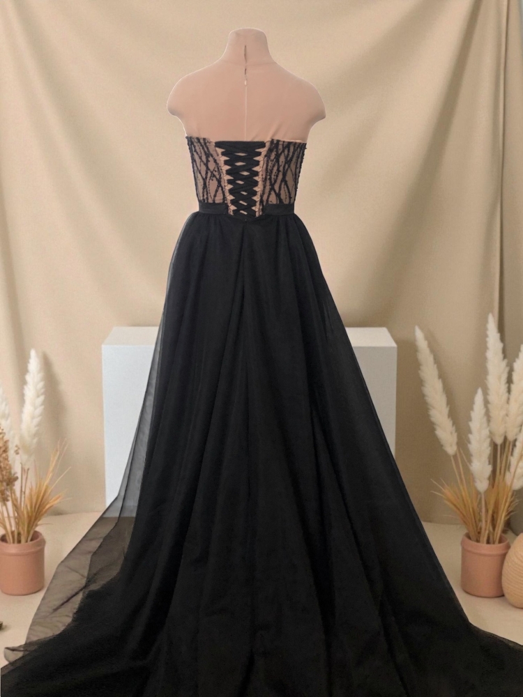 Cette création exceptionnelle se compose de deux pièces : un corset noir structuré et une jupe volumineuse en tulle dotée d’une traîne spectaculaire. Le corset, coupé légèrement en dessous de la taille, dessine parfaitement la silhouette, tandis que la jupe en tulle crée un effet de légèreté et de raffinement.