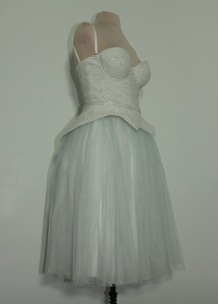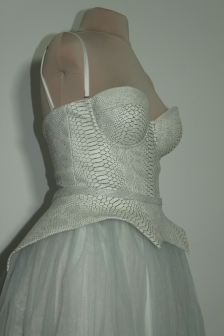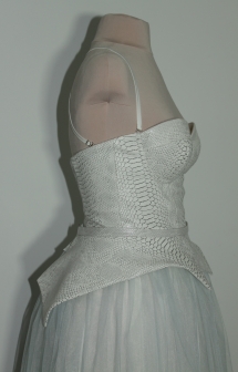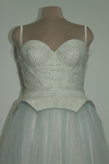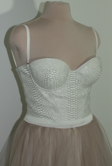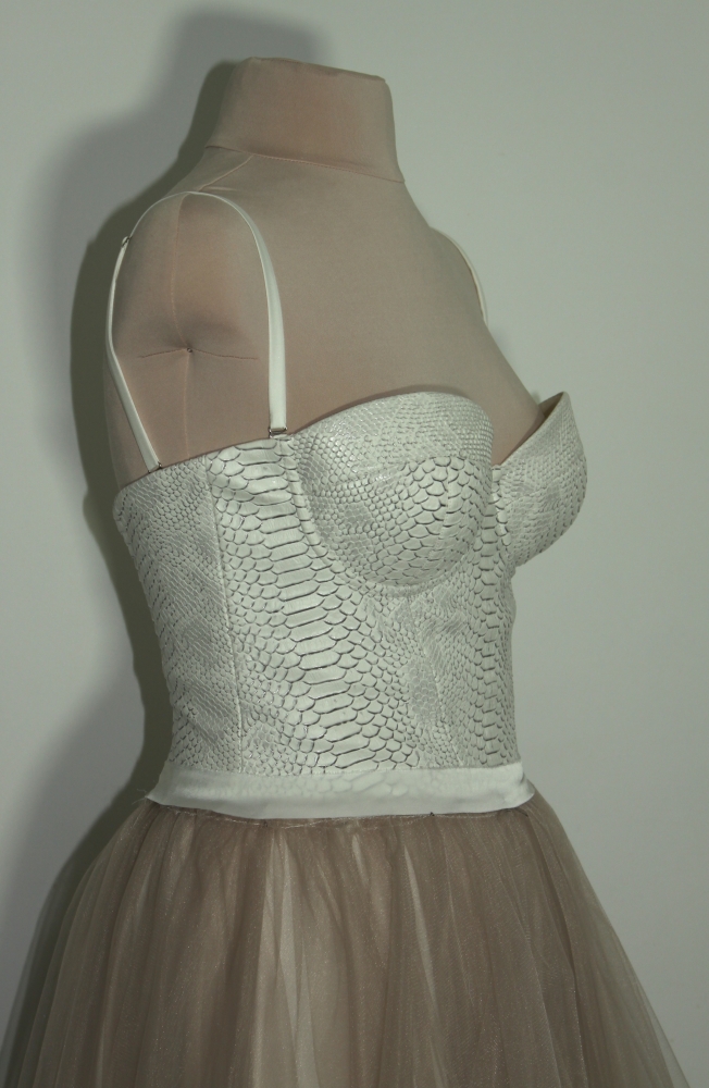 Apportez une touche d’audace et d’élégance à votre silhouette avec ce corset unique en cuir vegan à motif reptile. Sa teinte ivoire subtile, rehaussée de fines lignes argentées imitant la texture reptilienne, crée un effet visuel raffiné et moderne.