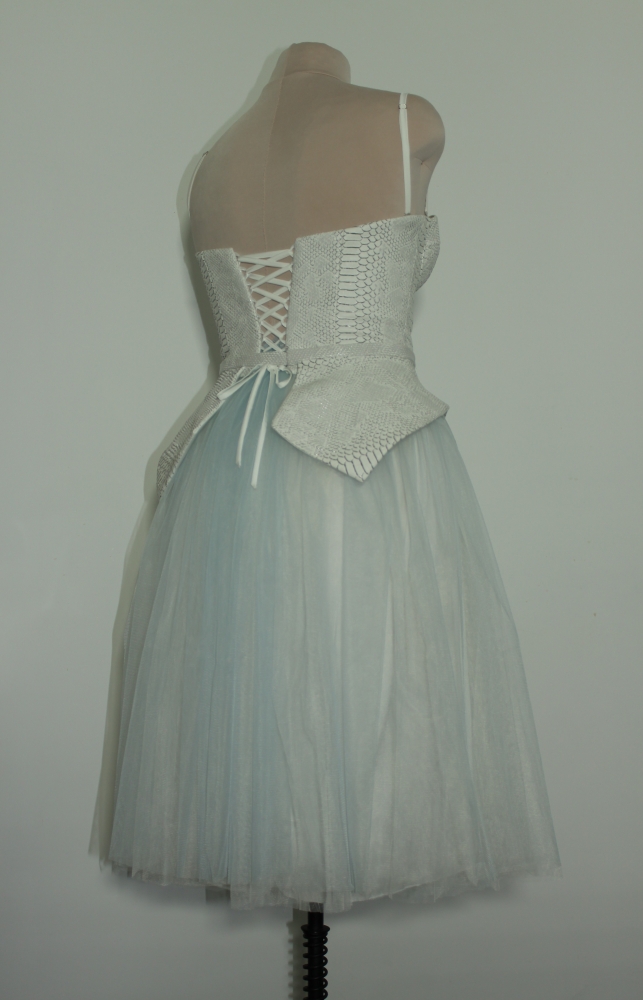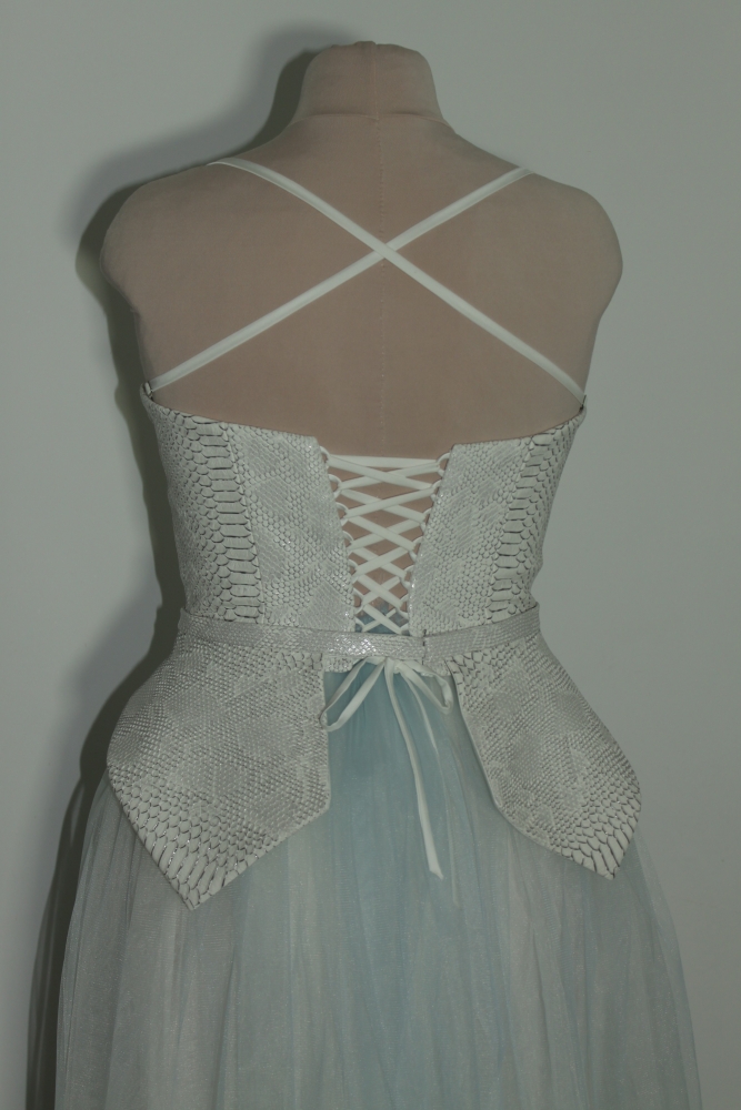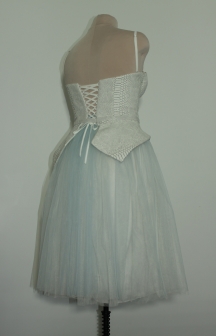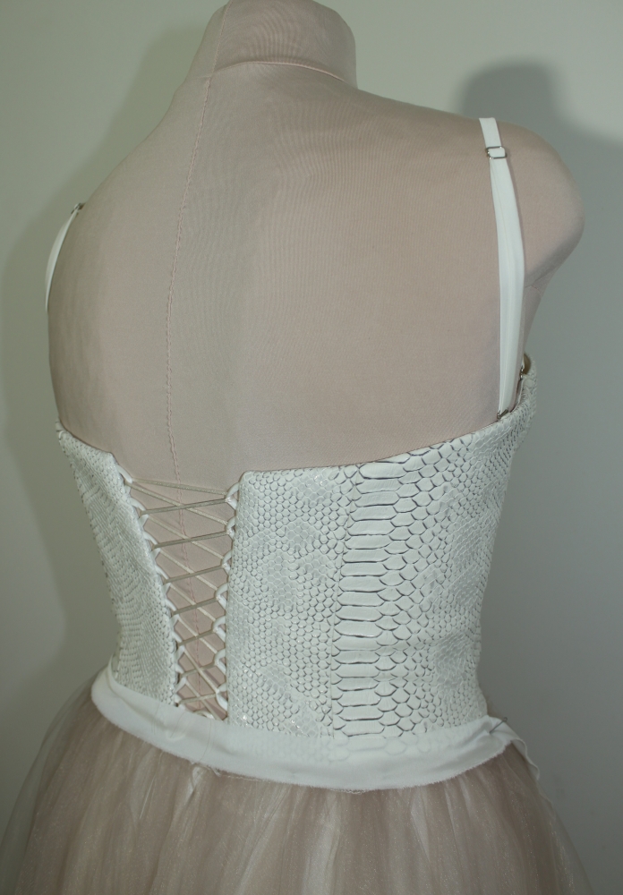 La fermeture à lacets dans le dos permet un léger ajustement, pour un maintien personnalisé et un confort idéal. Le modèle présenté convient actuellement à un tour de poitrine jusqu’à 90 cm et à un tour de taille jusqu’à 75 cm.