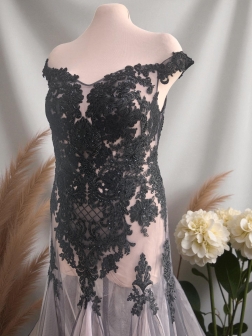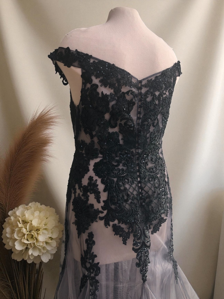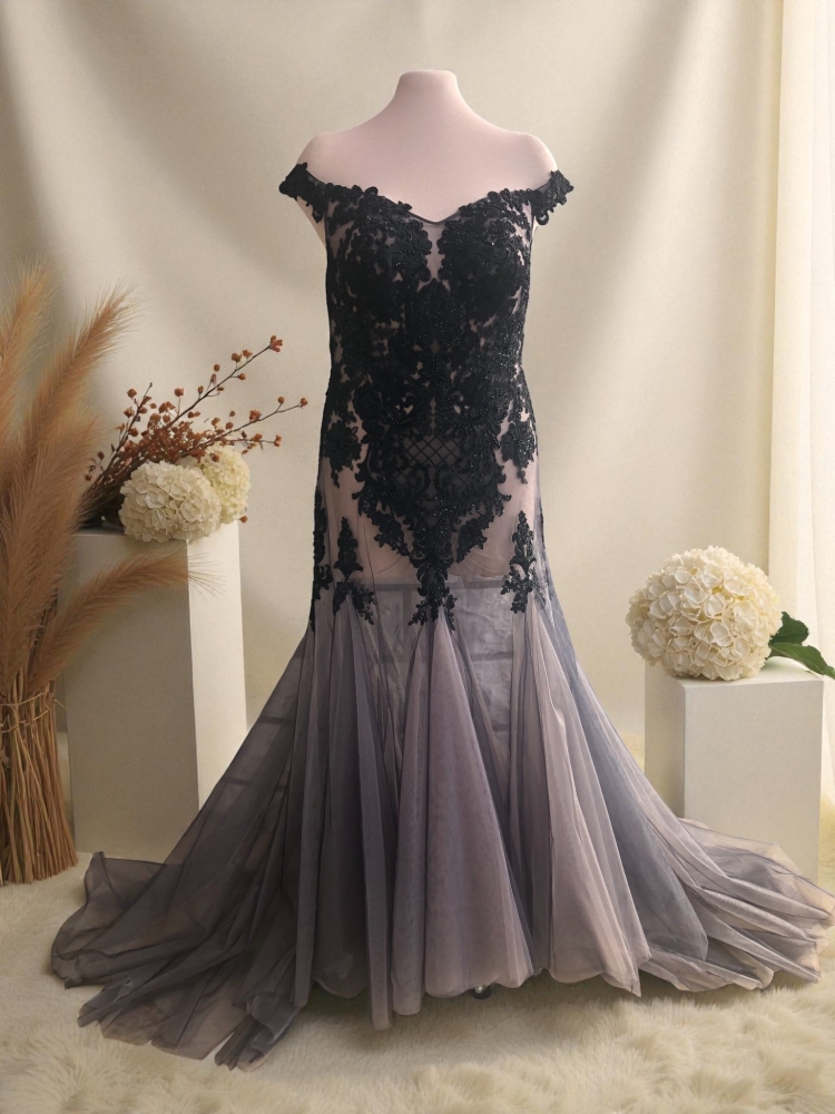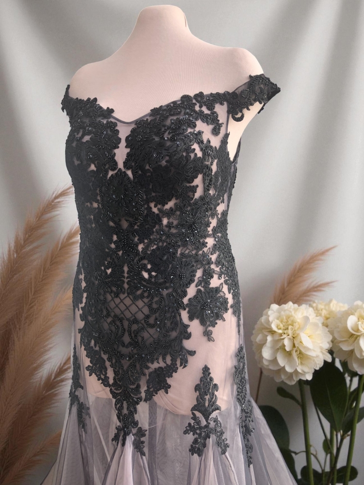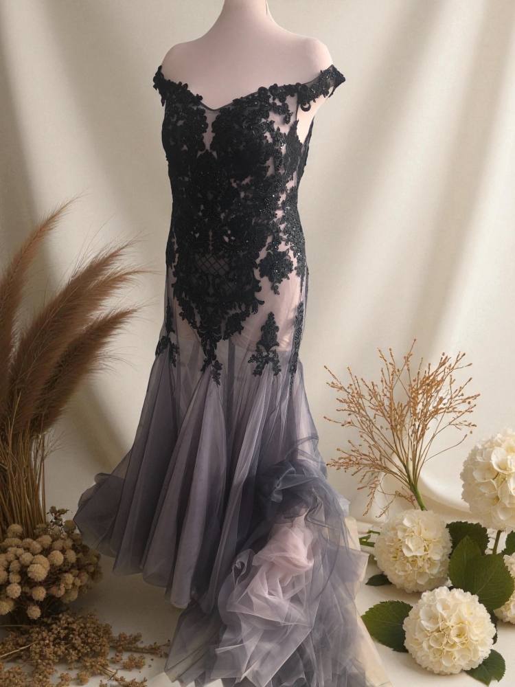 Sublimez votre silhouette avec cette robe sur mesure alliant audace et élégance. Conçue dans un style « poisson », la jupe volumineuse alterne trois teintes de tulle – rose pâle, lavande et noir – pour créer un dégradé sophistiqué. Le tulle supérieur noir est décoré d’applications de dentelle, brodées de perles et de sequins, offrant un éclat et un relief uniques.