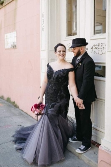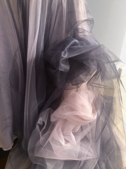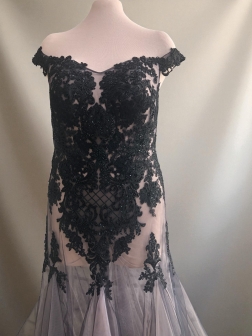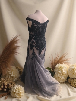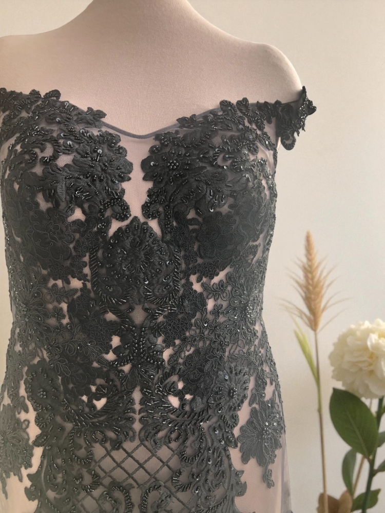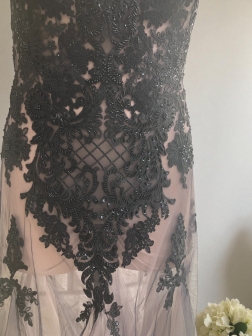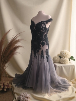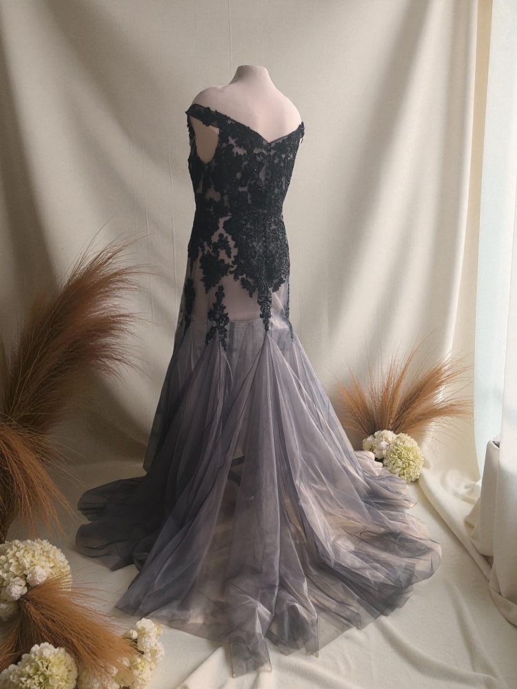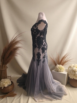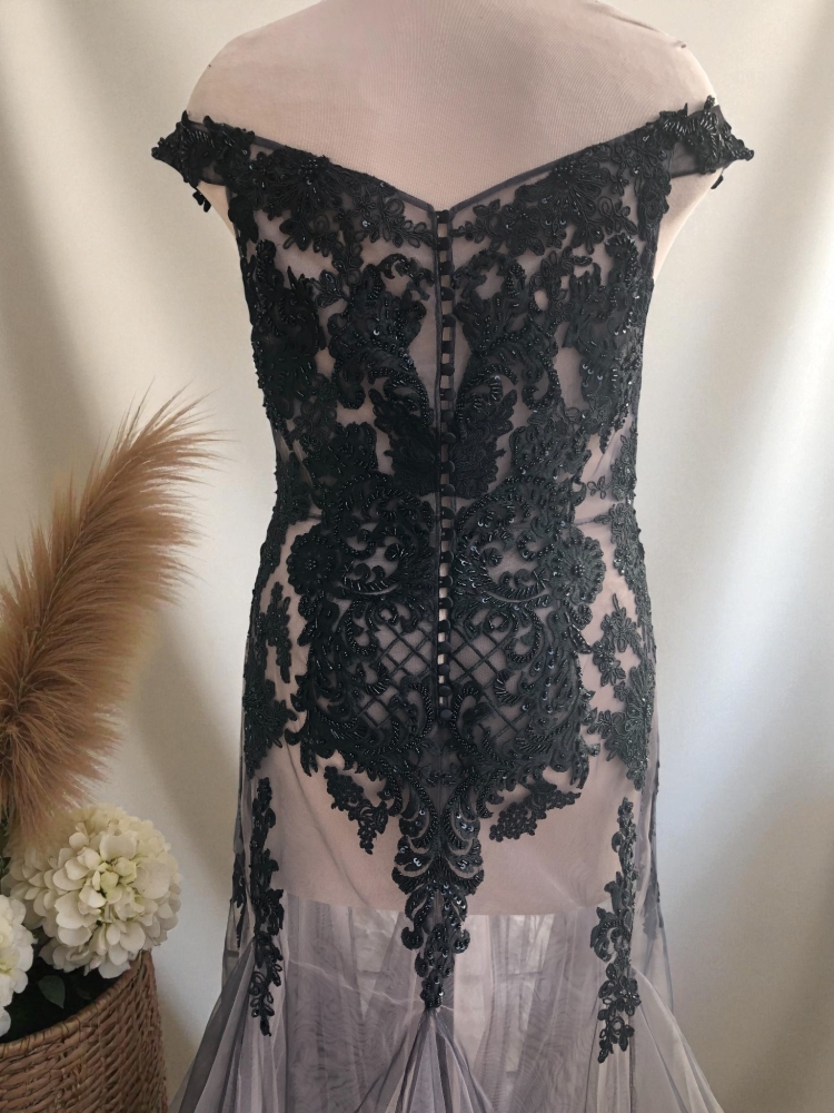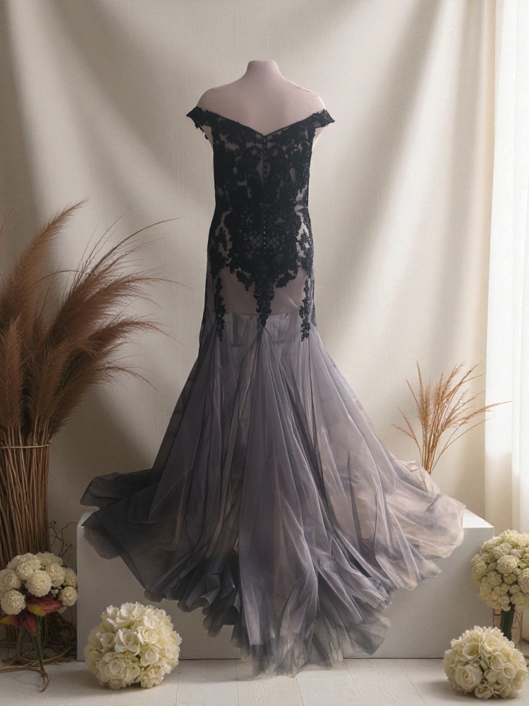 Sublimez votre silhouette avec cette robe sur mesure alliant audace et élégance. Conçue dans un style « poisson », la jupe volumineuse alterne trois teintes de tulle – rose pâle, lavande et noir – pour créer un dégradé sophistiqué. Le tulle supérieur noir est décoré d’applications de dentelle, brodées de perles et de sequins, offrant un éclat et un relief uniques.