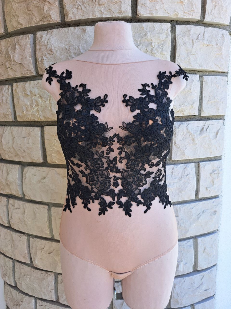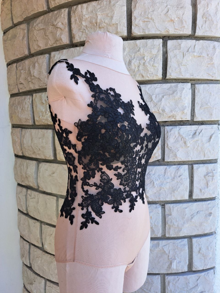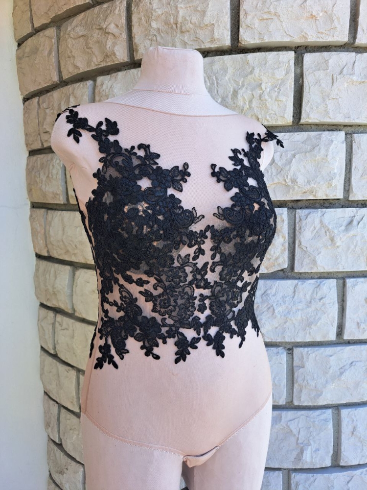 Appliqués en dentelle cordée noire sur le devant et le dos, formant un motif circulaire décoratif unique