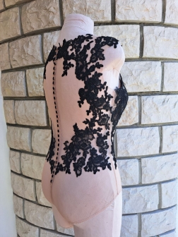 Fermeture au dos avec rangée de boutons noirs assortis à la dentelle