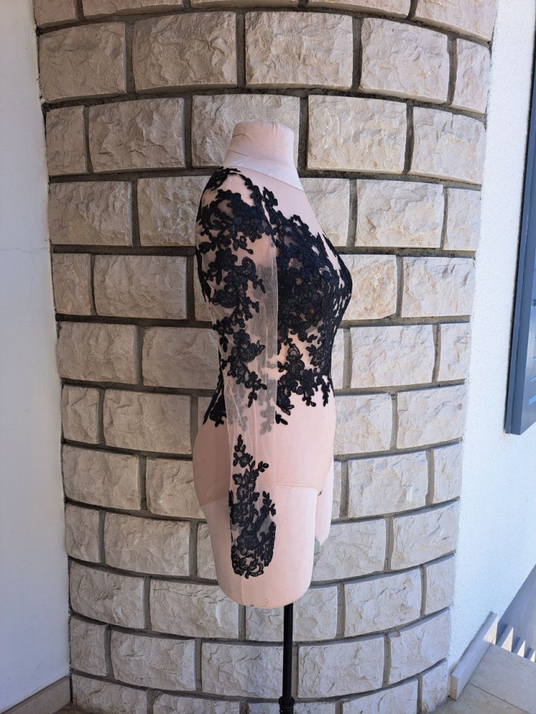 Dentelle noire appliquée sur le devant, le dos et les manches, créant un motif élégant et sophistiqué