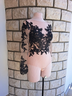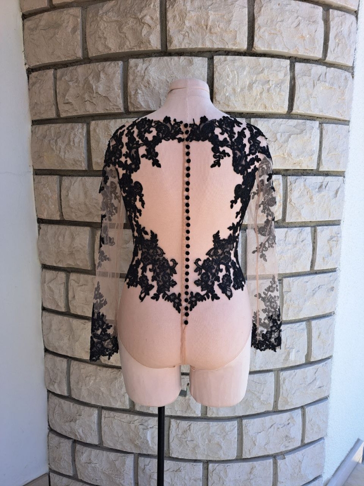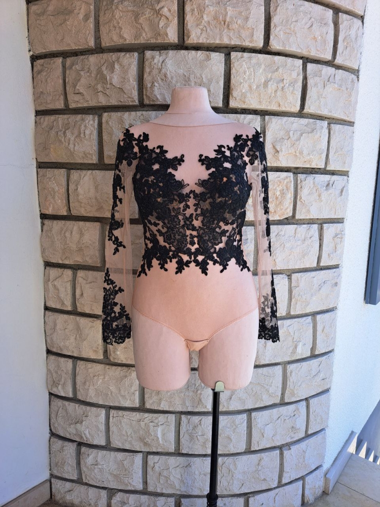 Succombez à l’élégance et à la sophistication avec ce bodysuit en tulle beige effet seconde peau, sublimé par de raffinés appliqués en dentelle noire volumineuse. Conçu pour valoriser la silhouette, il est idéal comme pièce maîtresse d’un look Black Wedding Dress, ou à associer avec vos jupes, pantalons ou ensembles chics pour des soirées et événements spéciaux.