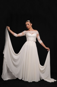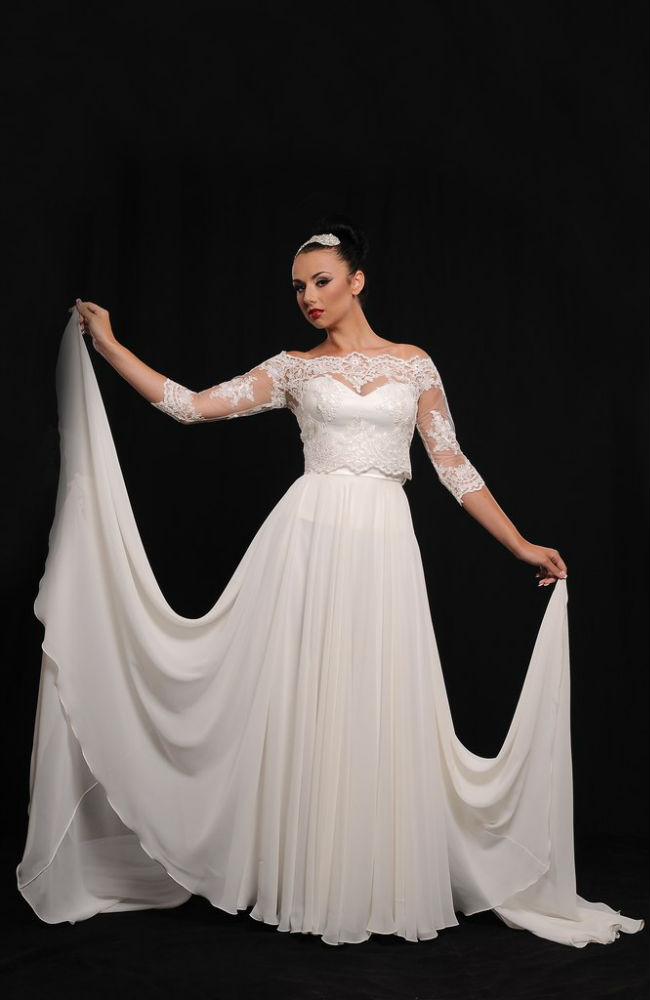 Élégante jupe de mariée en mousseline fluide et semi-transparente, doublée d’un satin doux qui lui confère légèreté et confort.