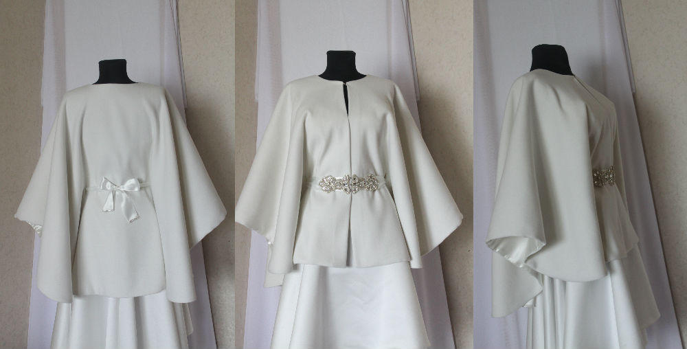 Élégante cape de mariée en drap chaud, doublée de satin doux et soyeux, parfaite pour sublimer votre tenue tout en vous apportant chaleur et confort pendant les journées fraîches.