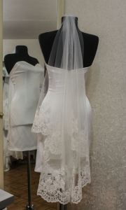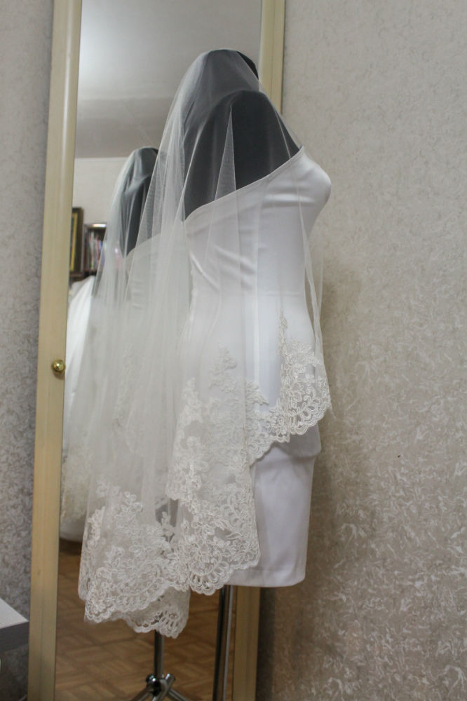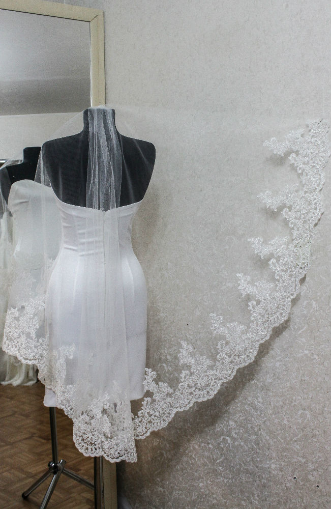 Ce voile de mariée à un seul couche (longueur 75 cm, largeur 150 cm) est orné d’une dentelle délicate avec un cordon en relief soulignant les motifs floraux tout autour du bord.
