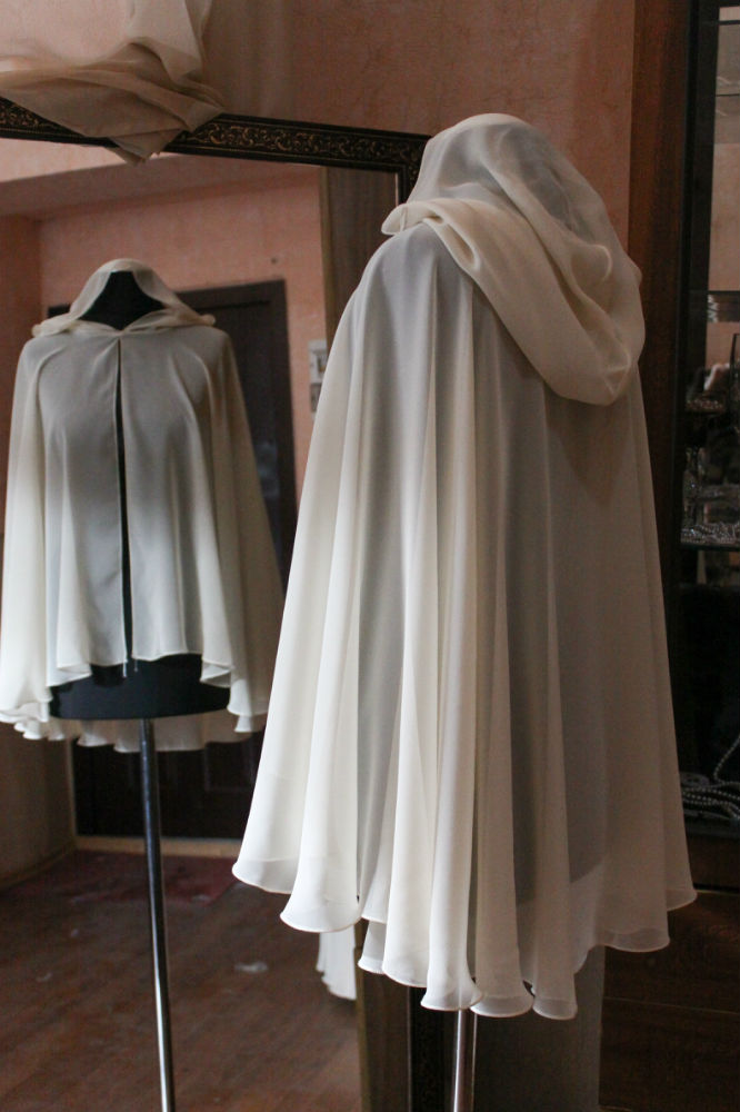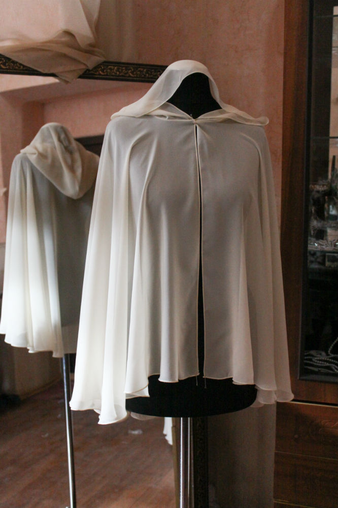 Cette cape de mariée courte avec capuche (longueur dos 75 cm) est une création délicate pensée pour les cérémonies religieuses, les séances photo ou les mariages civils.