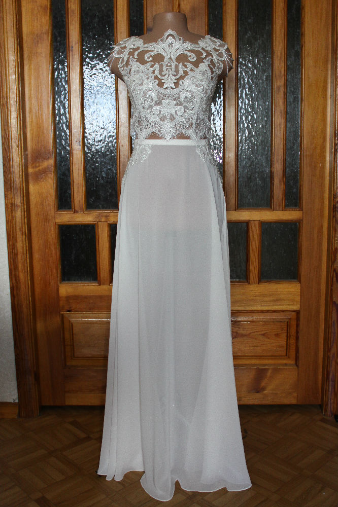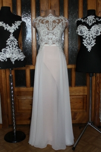 une jupe longue amovible et transparente en chiffon, ornée d’applications de dentelle délicatement disposées à la main.