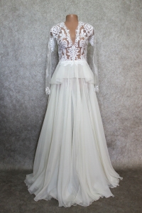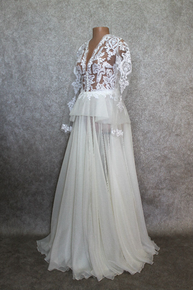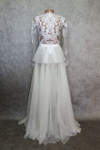 une blouse en dentelle délicate, réalisée à la main dans la technique d’application sur tulle,