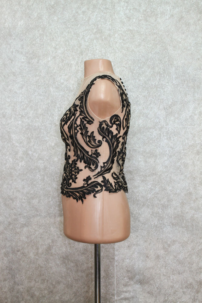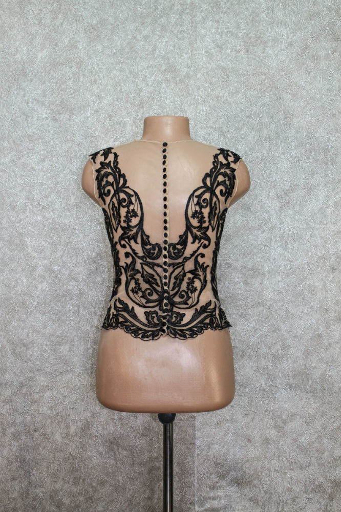 Cette blouse, réalisée précédemment en noir, a déjà trouvé preneuse. Cependant, il est possible de créer une copie exacte ou un nouveau modèle sur mesure selon vos souhaits et votre style.