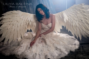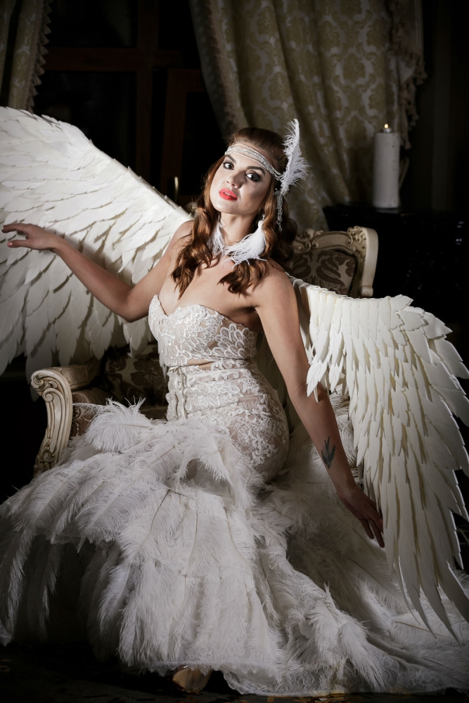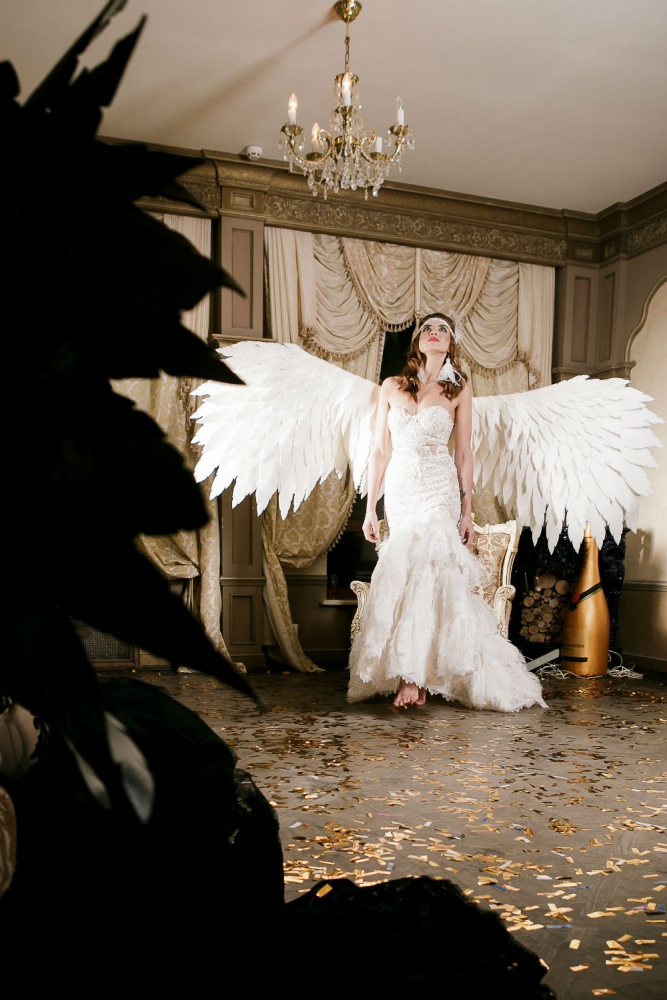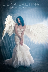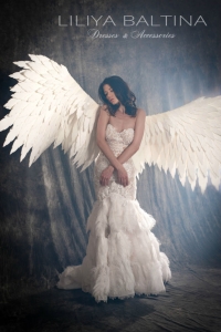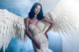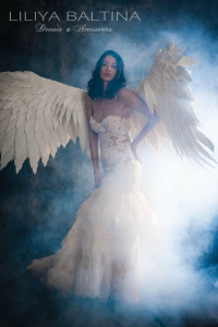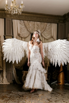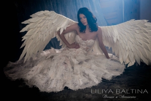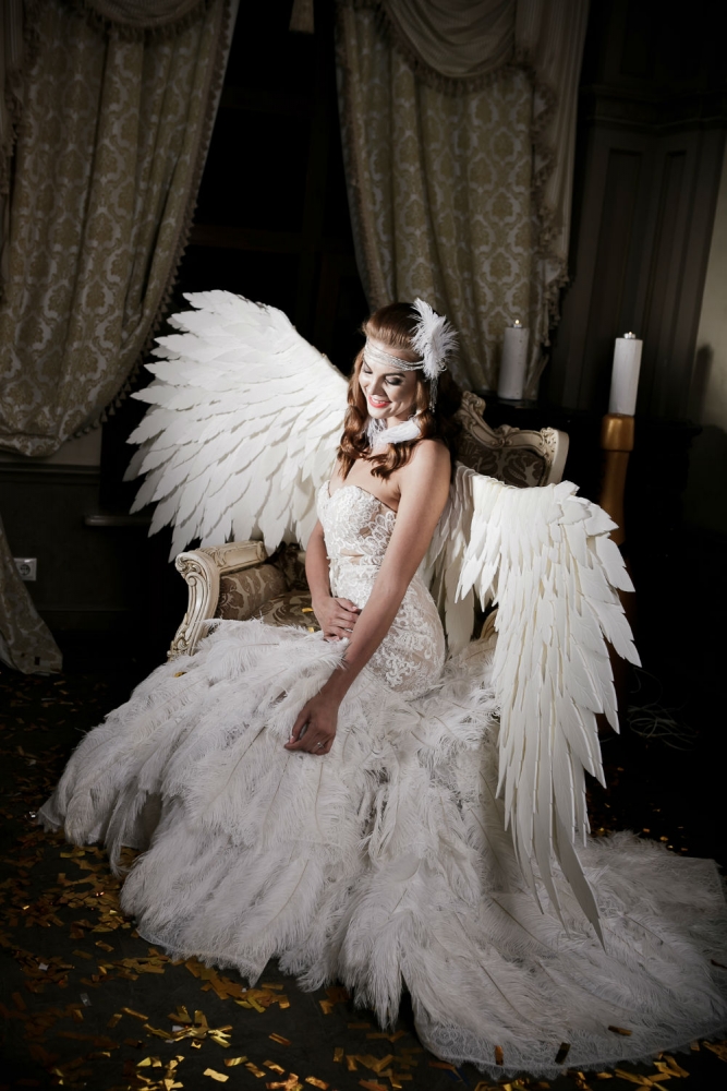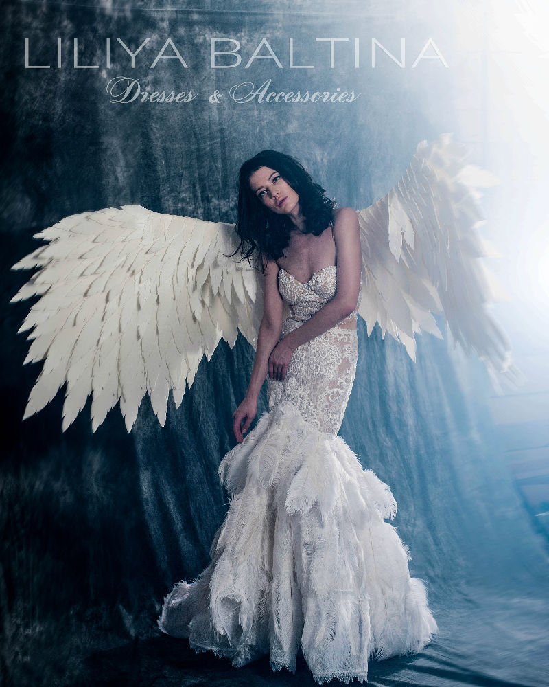 Le look peut être sublimé par les ailes d’ange blanches créées dans le même esprit poétique, pour une allure féérique et inoubliable.