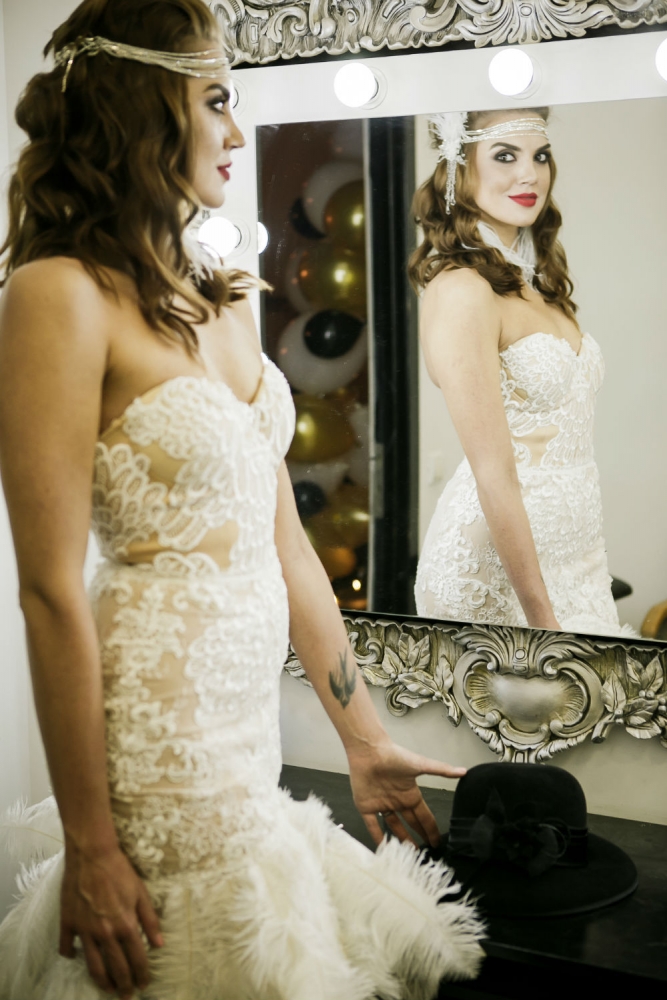 L’ensemble se compose d’une robe courte structurée avec bonnets intégrés, délicatement ornée de dentelle fine, et d’une longue jupe somptueuse décorée de plus de 200 plumes d’autruche, alternant avec de la dentelle “Chantilly” raffinée pour un effet aérien et lumineux.
