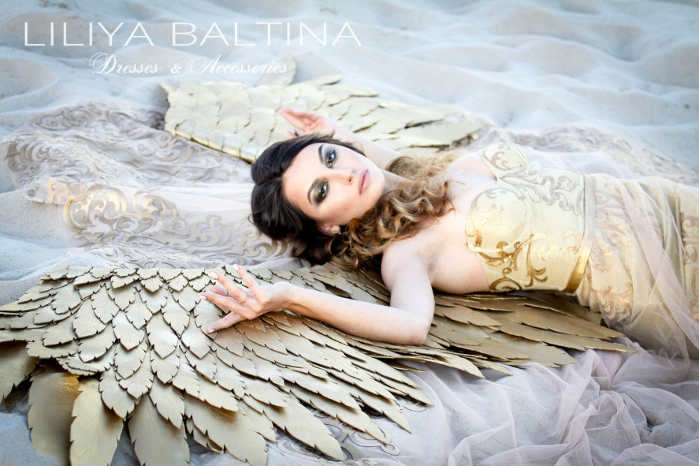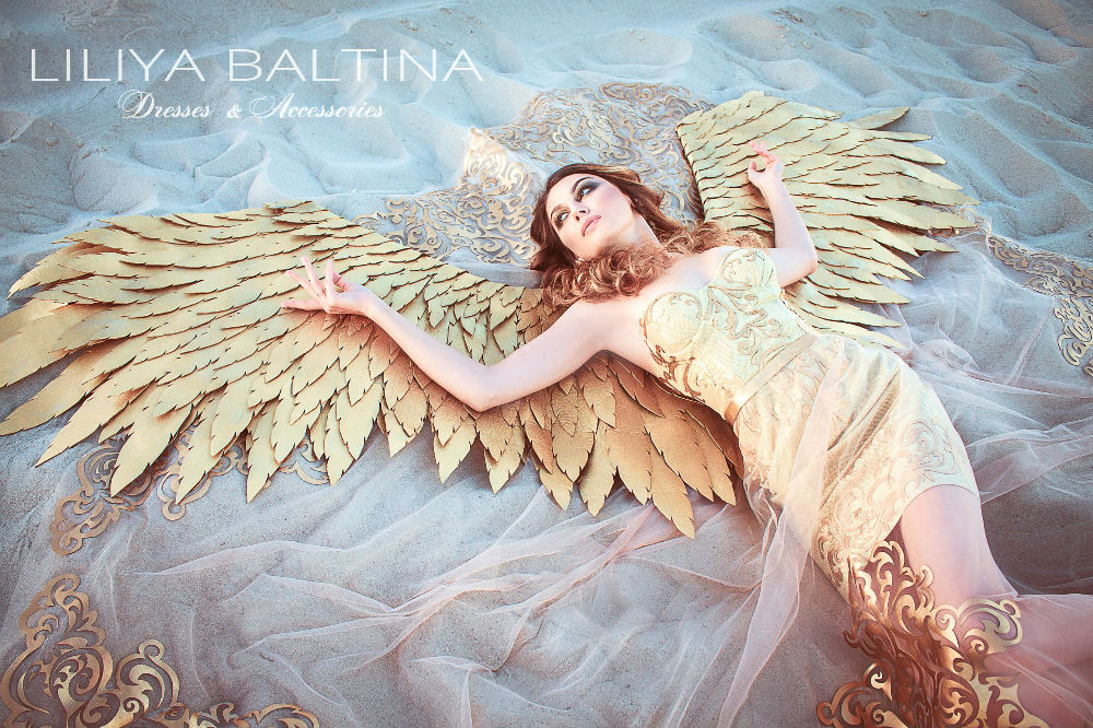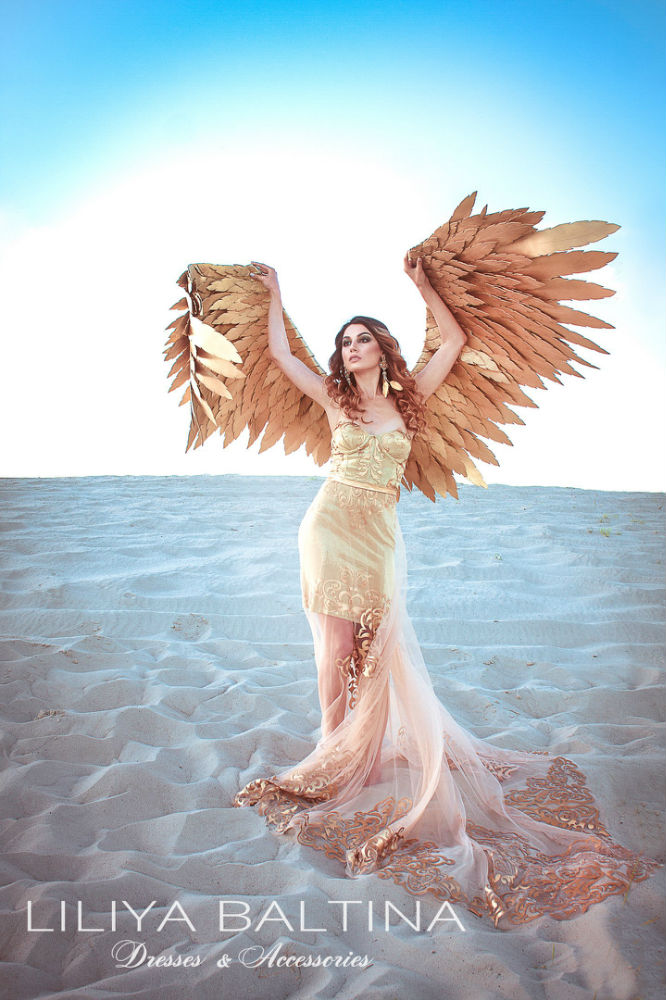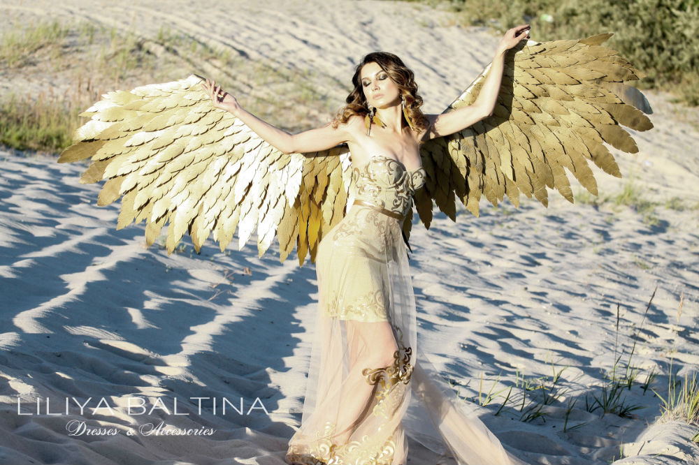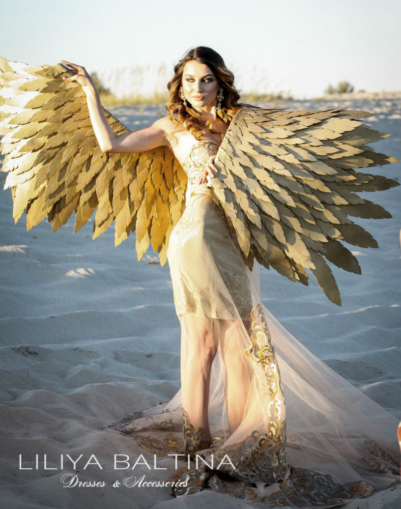 Le look peut être complété par les ailes d’ange dorées créées dans le même esprit artistique, pour un effet spectaculaire et poétique.