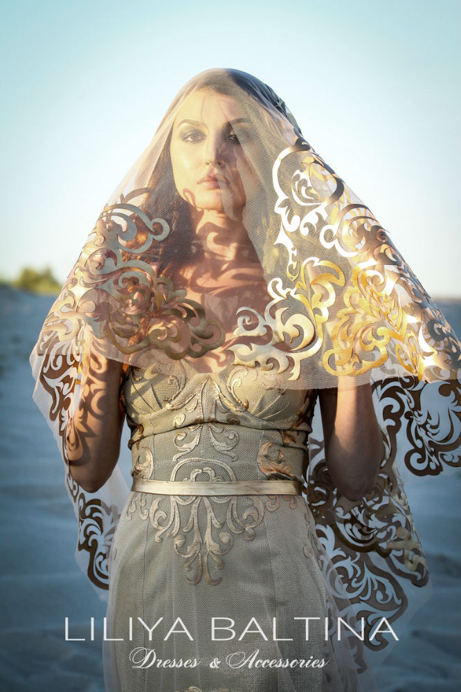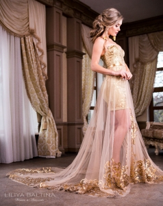 L’ensemble se compose d’une robe courte structurée avec bonnets intégrés et d’une longue jupe avec traîne, toutes deux délicatement ornées d’applications exclusives en cuir végétal doré qui confèrent à la tenue une allure à la fois moderne et majestueuse.