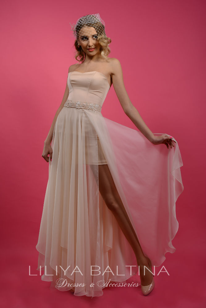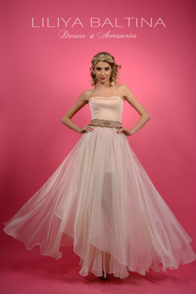 et une jupe longue en mousseline légère, d’un volume spectaculaire (coupe de 2 cercles), dont les pans évoquent des pétales en mouvement.