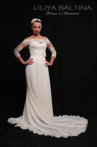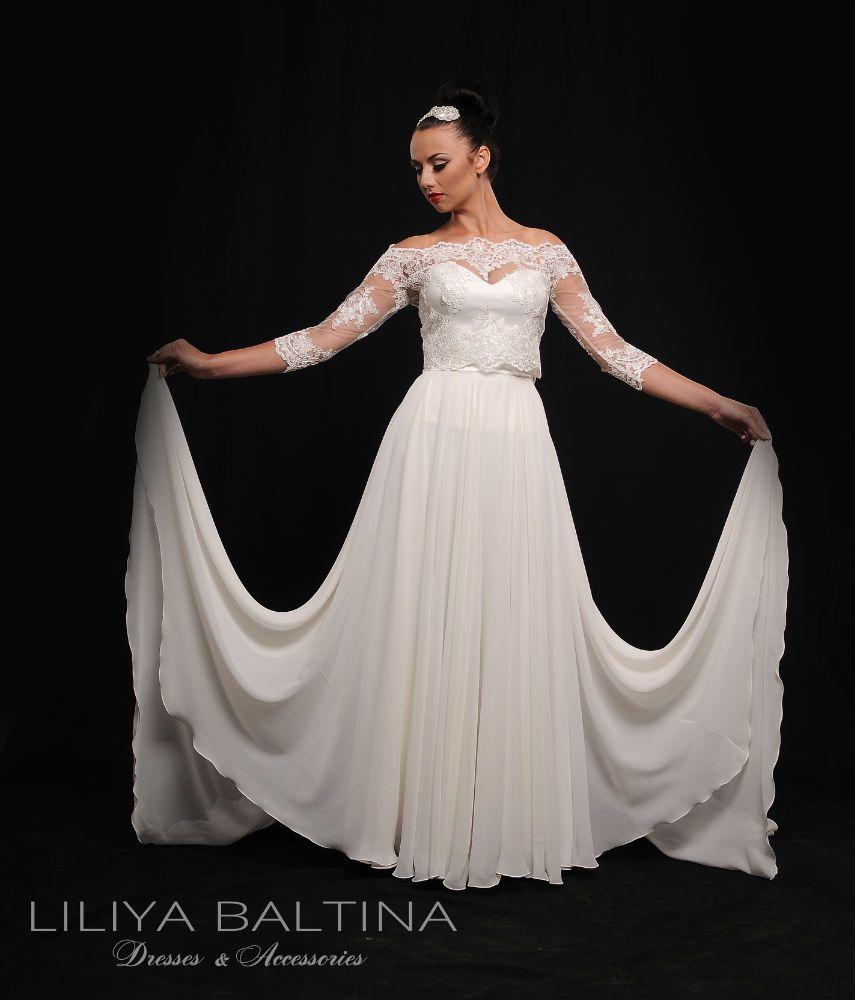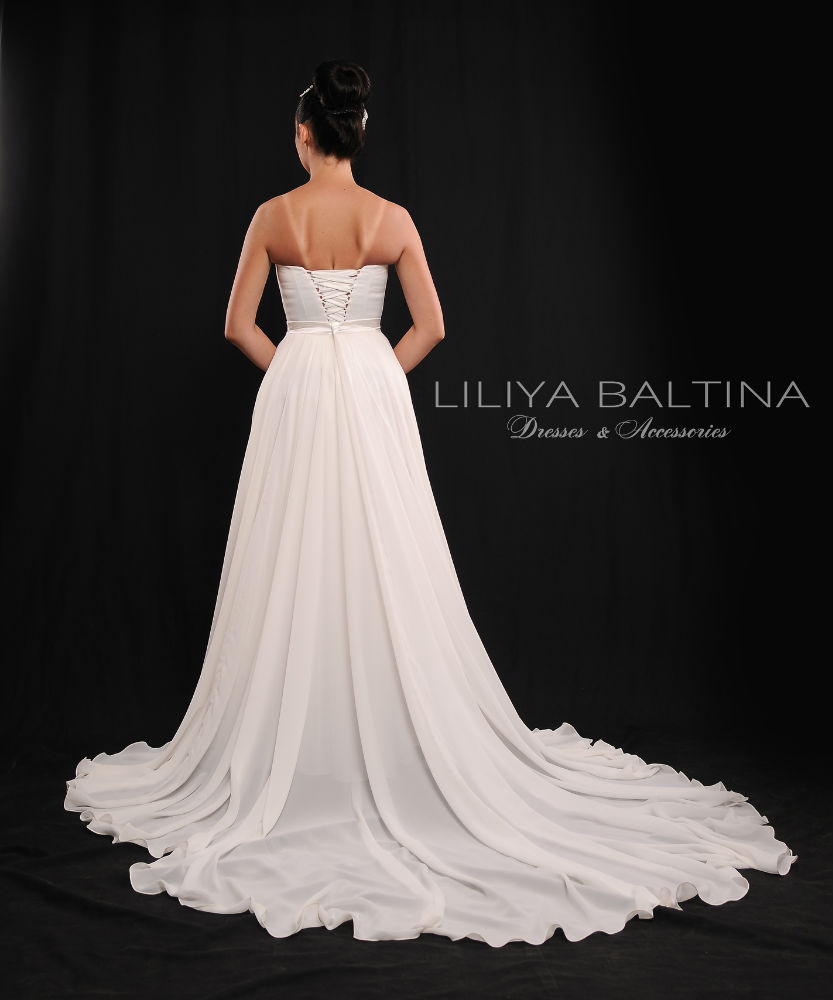 et une jupe longue en mousseline semi-transparente, doublée de satin, avec un volume exceptionnel (2 cercles) et une traîne d’un mètre pour un effet majestueux et aérien.