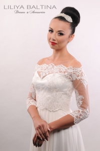 un haut en dentelle amovible à épaules dégagées, délicatement brodé,