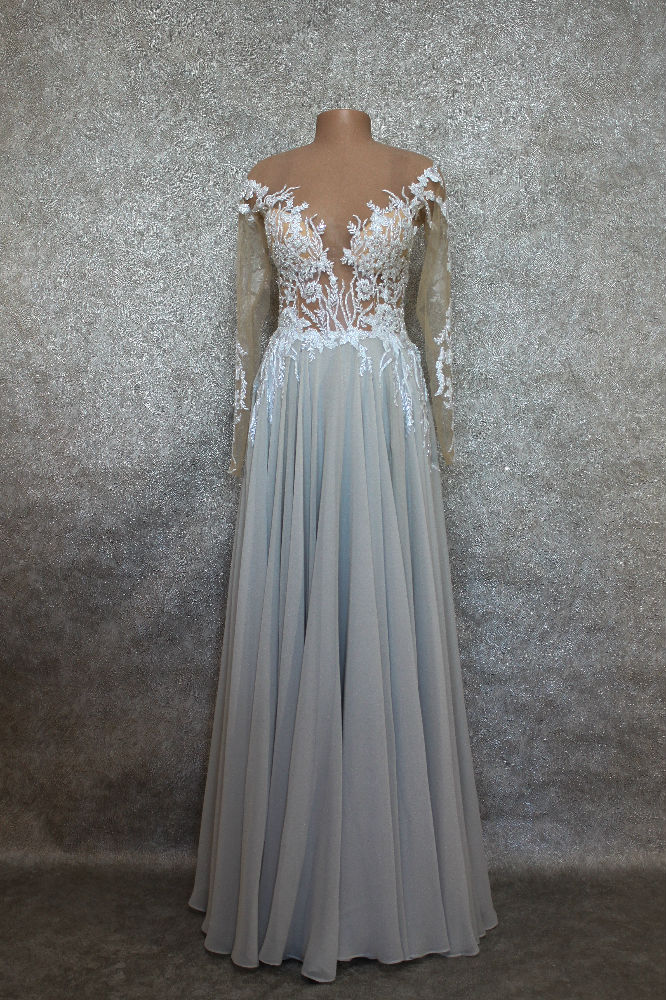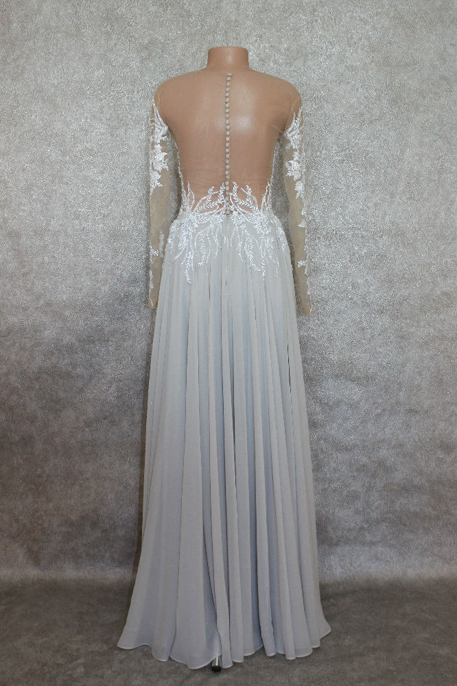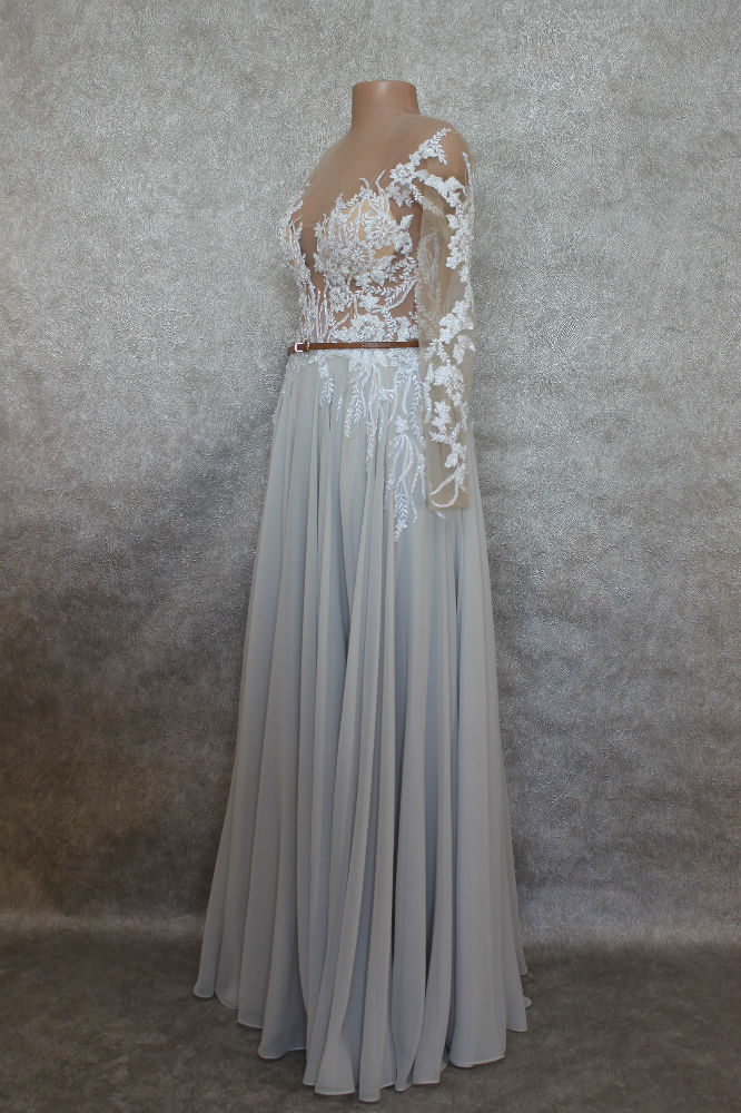 La jupe et sa doublure sont réalisées en satin et mousseline de soie gris tendre.