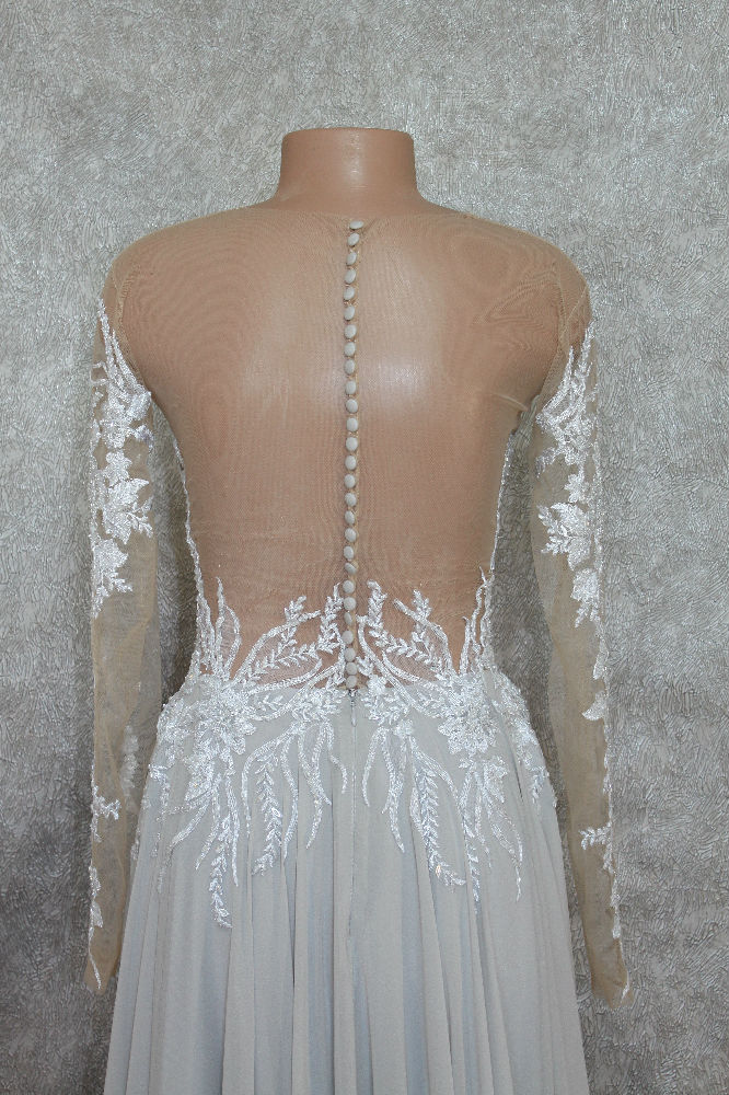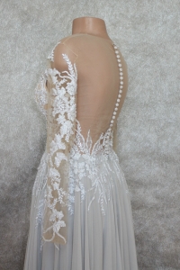Au dos, une fermeture à petits boutons recouverts du même tissu apporte une touche raffinée et délicate.