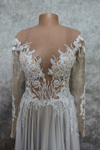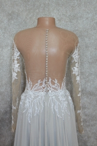 Le corsage est confectionné sur une base en tulle couleur chair, décoré d’une application de dentelle minutieusement sélectionnée et cousue à la main.
