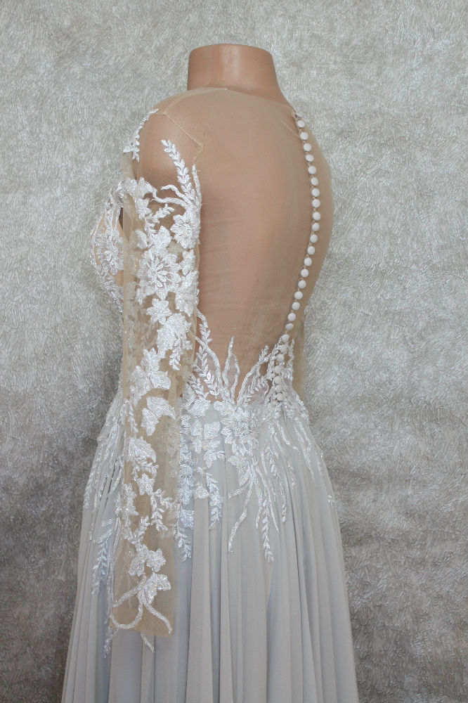 Cette robe de mariée élégante est un exemple d’une création personnalisée réalisée pour une cliente, en tenant compte de chacun de ses souhaits.